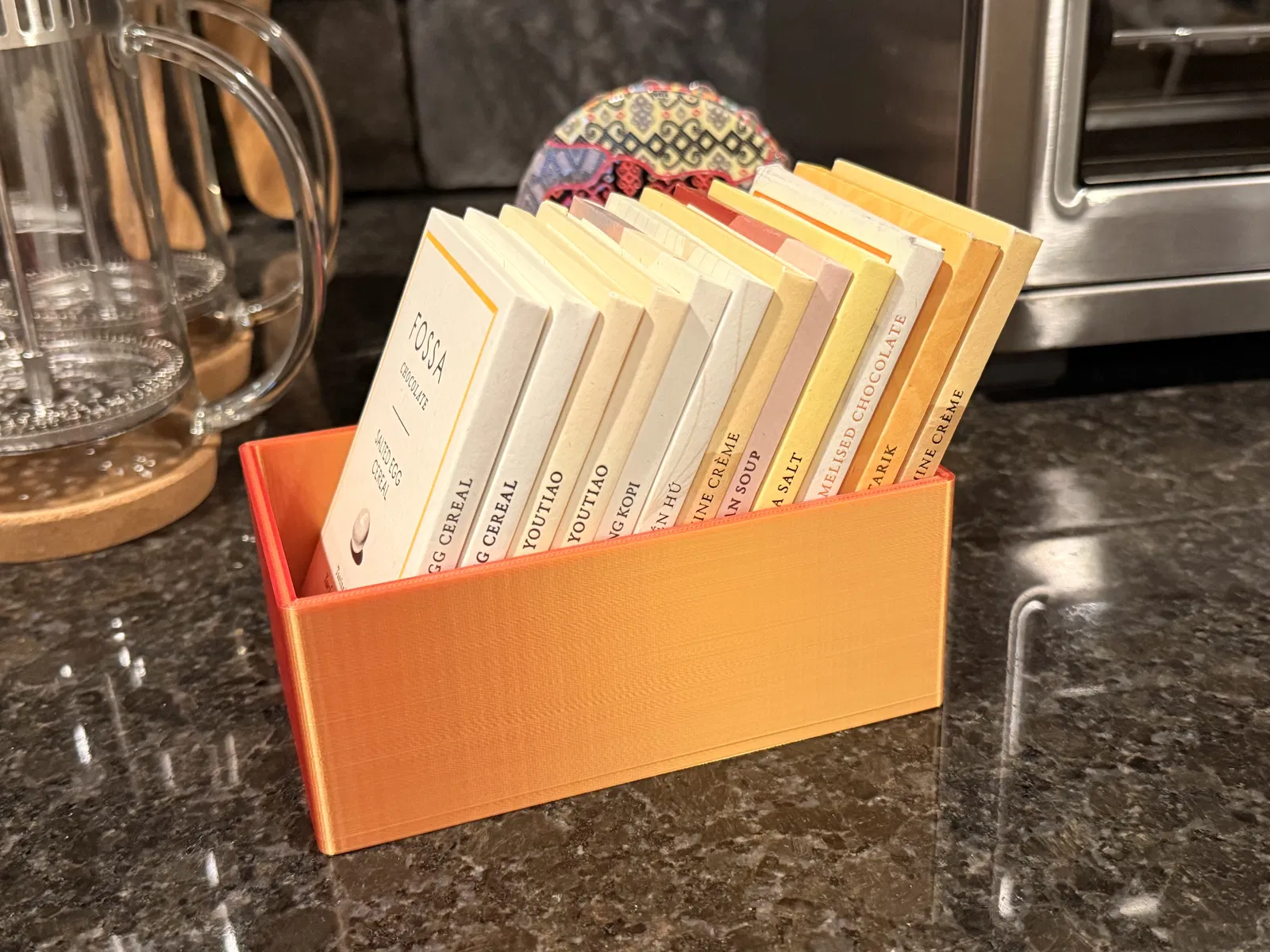 Giỏ khay trưng bày & sắp xếp thiết kế riêng cho hộp Fossa Chocolate retail. Miệng mở, đáy phẳng dễ in FDM, không cần supports. Chứa thoải mái 15 thanh (16 sẽ chật), có logo dập nổi tinh tế ở đáy trong.