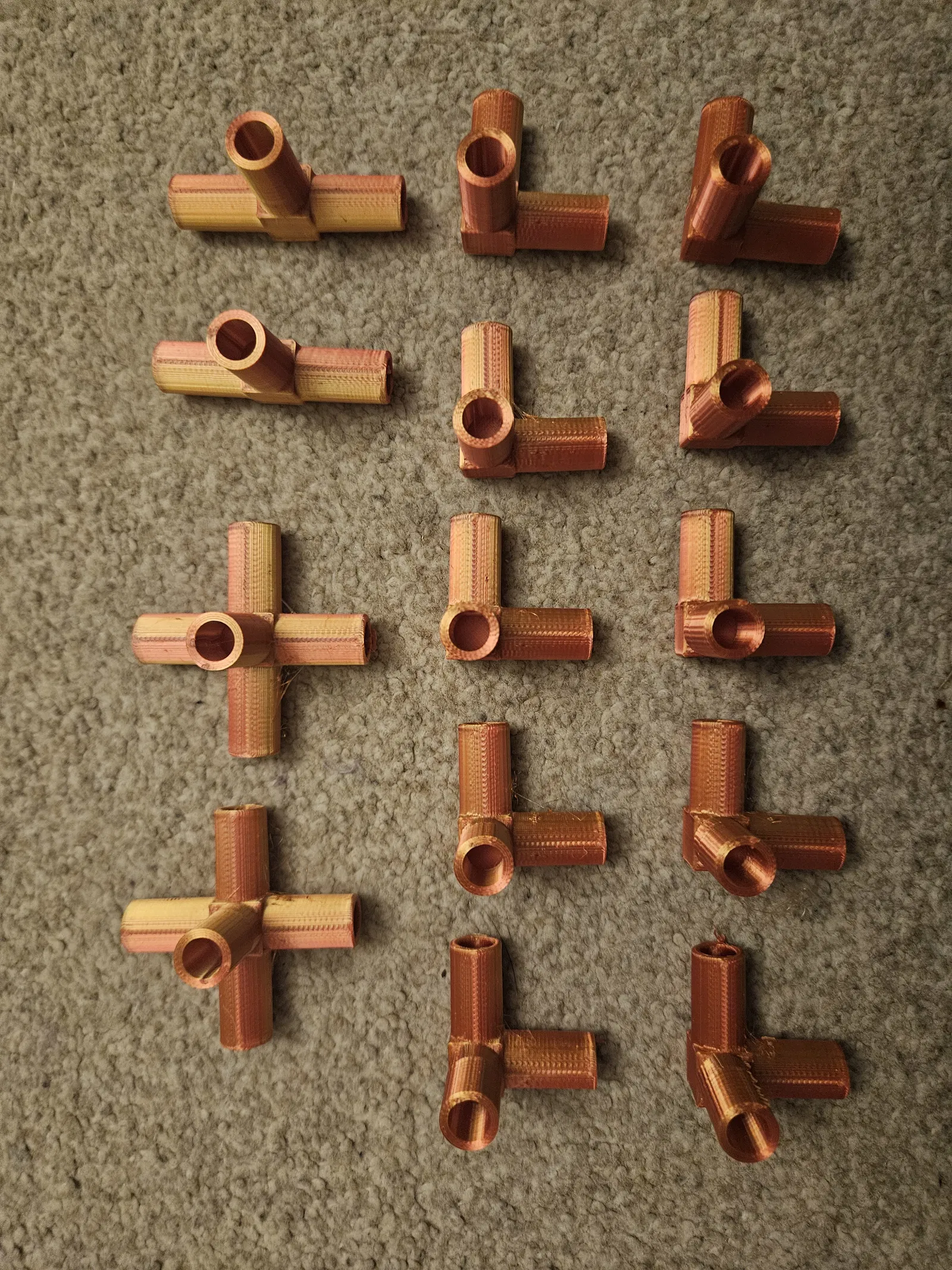 Bộ đầu nối khung ống (tubular) cho thiết kế dùng pole như enclosure máy in 3D hoặc tent poles. Gồm 6 kiểu nối, tối ưu cho carbon rods với đường kính trong 8mm theo slicer và có thể scale theo nhu cầu.