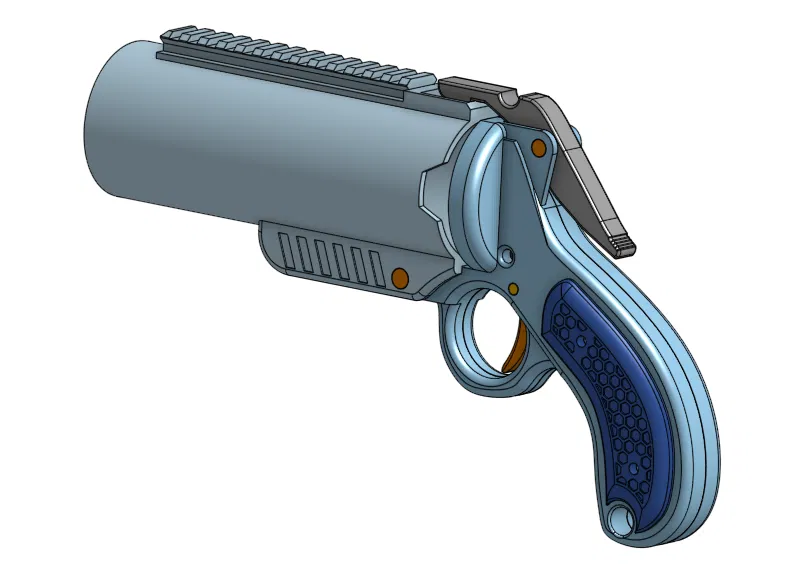 Fortinbras là một flare blaster bắn 1 phát, được in 3D hoàn toàn, không cần bất kỳ phần cứng nào ngoài dây thun elastic 1/8 inch (các cỡ khác chắc cũng dùng được). Nó bắn bằng stringer shells do mình cũng tự thiết kế. Shells được thiết kế để bắn đạn Nerf Mega XL, nhưng cũng có thể bắn kiểu shotgun 4 viên đạn half length tiêu chuẩn nếu lắp thêm một cái insert.
