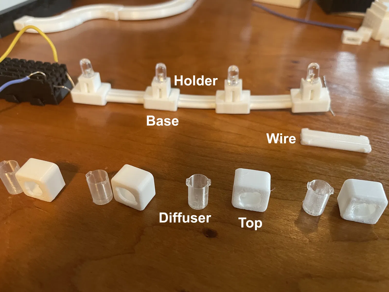 Lắp ráp (Assembly): Thứ tự lắp hiệu quả nhất là: (1) Đi dây cho LED và điện trở vào từng LED_holder rồi gắn vào base. Kiểm tra kết nối bằng một ít hookup wire và pin coin. Có hai rãnh để bẻ chân anode và cathode của LED vào đúng vị trí. (2) Cắt hai sợi buss wire 22 gauge (hoặc tuốt vỏ dây hookup wire) dài khoảng 150% so với chiều dài cần cho bố trí của bạn. (3) Đi dây cho LED ở xa nguồn nhất trước, rồi luồn hai sợi dây đã tuốt qua wire holder(s) và connector đến LED_holder kế tiếp. Cây chọc SIM rất tiện để thông/nới các lỗ trong LED_holder lúc đầu, đồng thời đẩy dây lệch sang bên để dễ thao tác đi dây cho từng LED_holder. (4) Lặp lại cho tới khi tất cả LED đã được đi dây. Mỗi lần thêm một LED vào mạch thì kiểm tra lại bằng pin coin để chắc chắn tiếp xúc ổn. (5) Khi hoàn tất toàn bộ đi dây, gắn LED_tops và _diffusers vào. (6) Các loại bulb khác nhau sẽ trượt vào LED tops nếu bạn muốn kiểu “holiday” thay vì kiểu LED âm trong dự án. Nhắn mình nếu bạn muốn file STL của phần base để tự thiết kế bulb riêng.