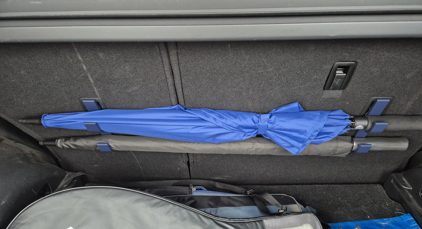 Móc treo dù (umbrella holder) gắn vào ngàm ISOFIX, thiết kế dạng móc đôi đơn giản, vừa cho Hyundai Tucson và Kia Sportage. Chỉ cần ấn xuống là kẹp vào chắc chắn, tiện treo 1–2 cây dù trong xe.