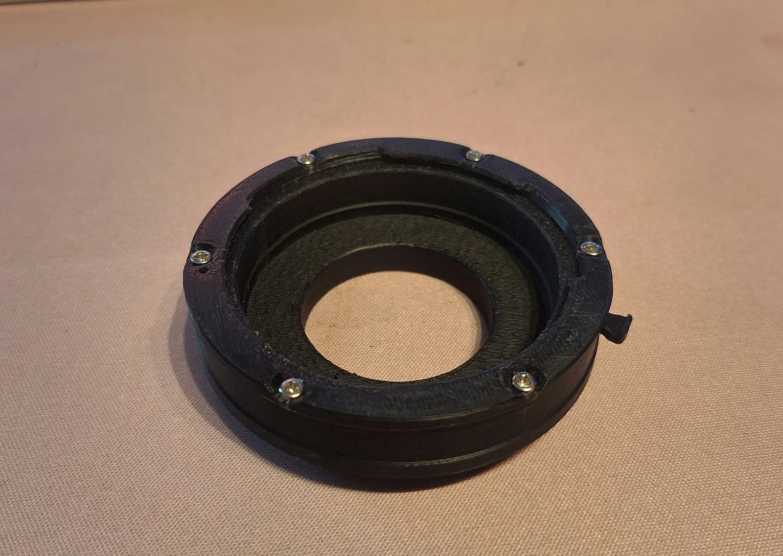 Adapter này được in thành 3 phần và cần 6 con ốc. Tác giả gốc của các base model khuyên nên taro lỗ lên chuẩn M1.6 và dùng ốc M1.6x5, nhưng mình thấy dùng ốc M2.5x5 không cần taro vẫn chạy (ít nhất là với ABS). Ngoài ra, mình khuyên nên sơn mặt trong của adapter bằng sơn đen mờ (matte black) để tránh phản xạ ánh sáng không mong muốn, kể cả khi bạn in bằng nhựa màu đen.