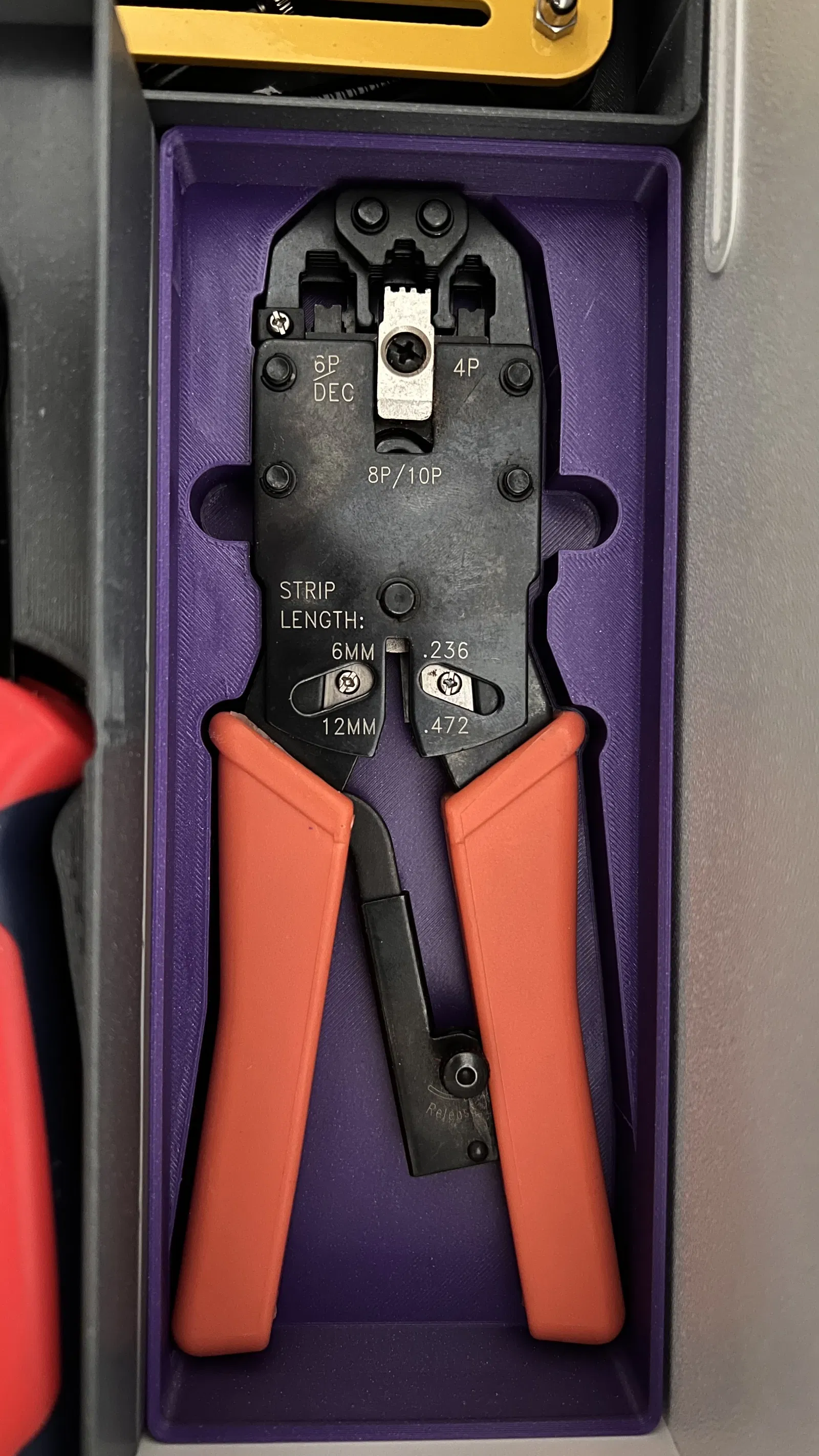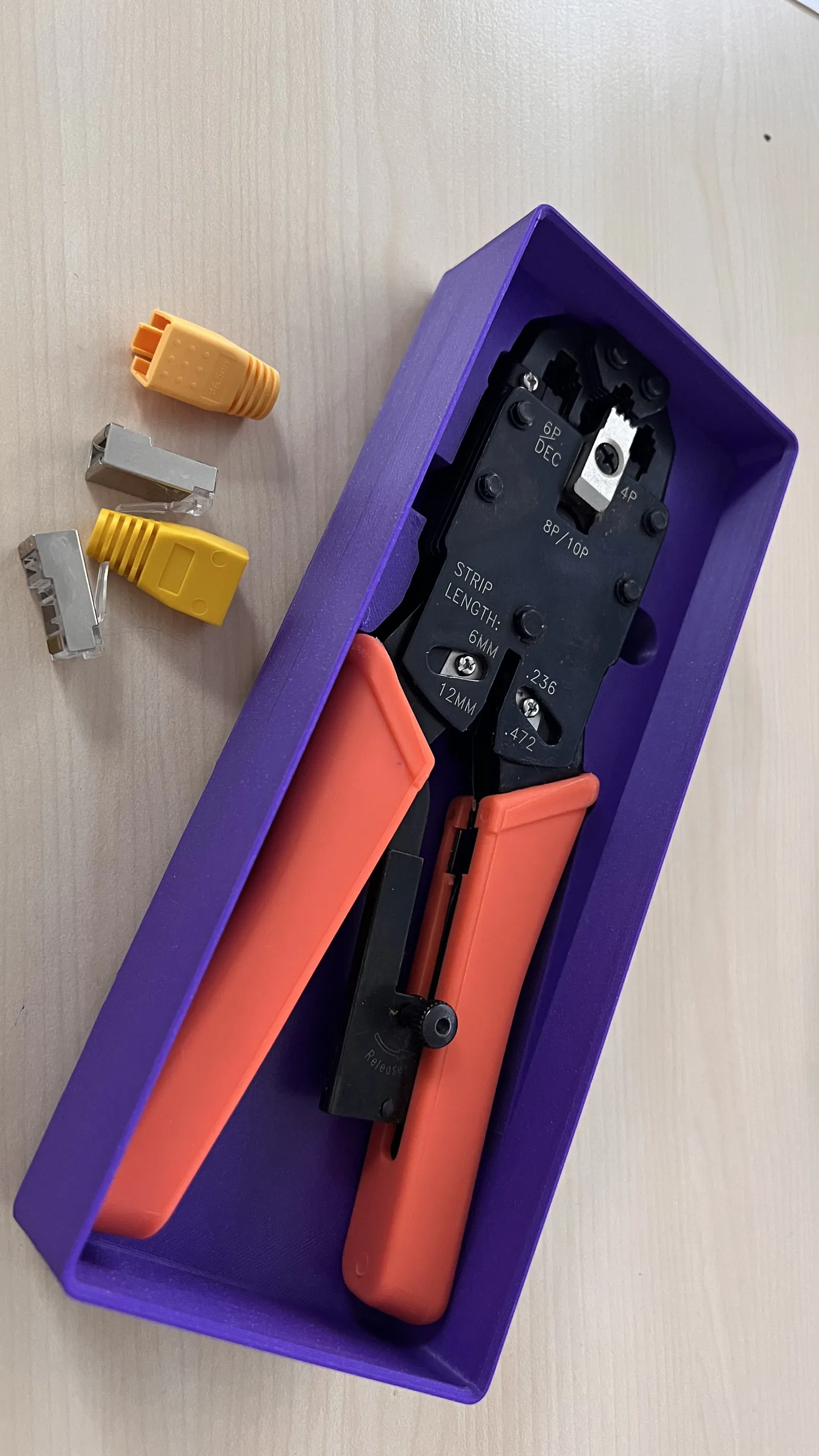 Khay Gridfinity thiết kế để đựng kìm bấm RJ45 (RJ45 crimping tool), giúp sắp xếp gọn gàng trong hệ lưu trữ Gridfinity. Kích thước theo chuẩn Gridfinity 2 x 5, chiều cao 5.