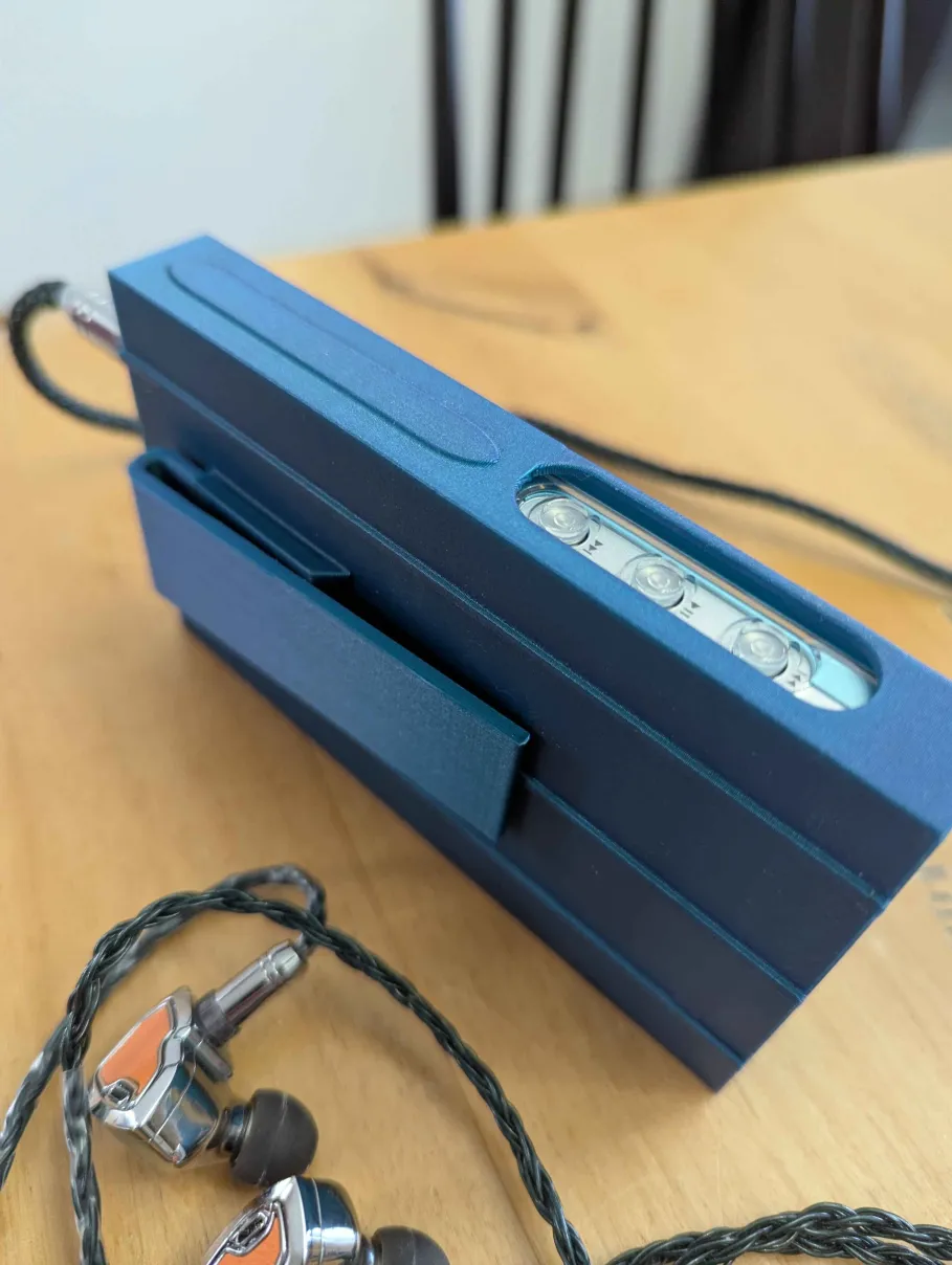 Case kẹp dành cho FiiO Jade Audio JM21 DAP khi đang dùng kèm ốp trong suốt zin. Thiết kế để đặt máy lộn ngược giúp dễ cắm tai nghe; khuyến nghị PLA/PETG, 3 walls, 15% infill và có thể cần chỉnh clip nếu in PETG.