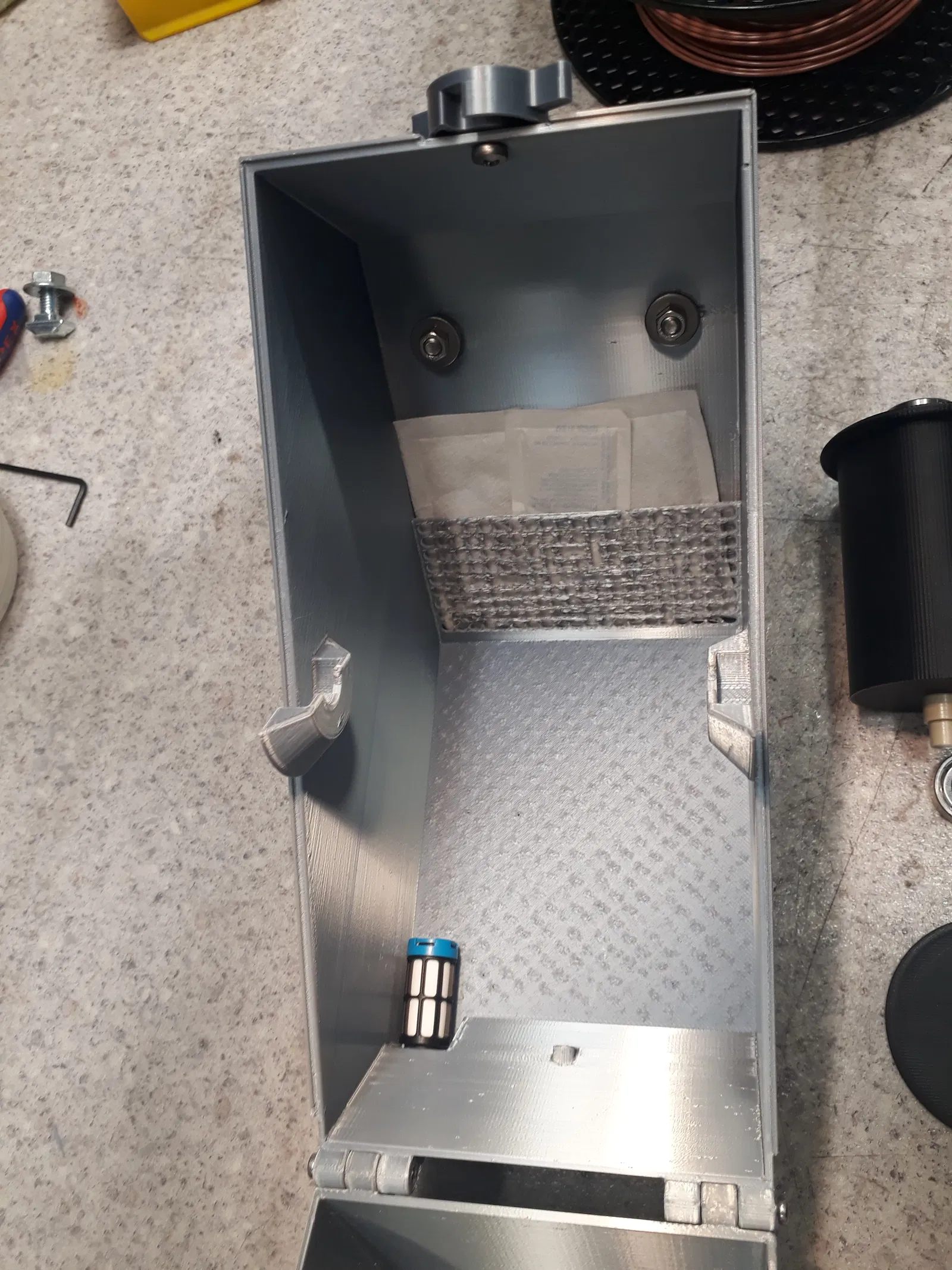 Hình chụp là lần test đầu tiên, chưa có lưới tháo rời để đặt các gói hút ẩm; phần này được in bằng nozzle 0.6 (tạm thời chưa tinh chỉnh) với layer height 0.2 mm.