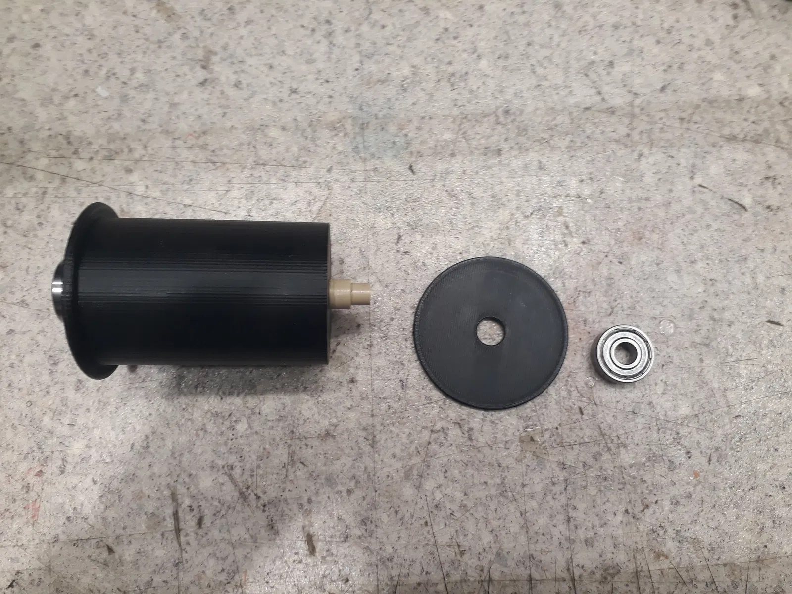 Sau vài lần thử không thành công, phần giữ cuộn (chỗ “šuple”) đã được thay trục in bằng một thanh tròn không in, trên đó gắn vòng bi (1 cái cố định, 1 cái lỏng hơn để thay cuộn dễ dàng). Drybox có 2 lựa chọn đường ra filament, có cấp khí khô thông qua các component của hãng Festo và có đồng hồ đo độ ẩm & nhiệt độ.