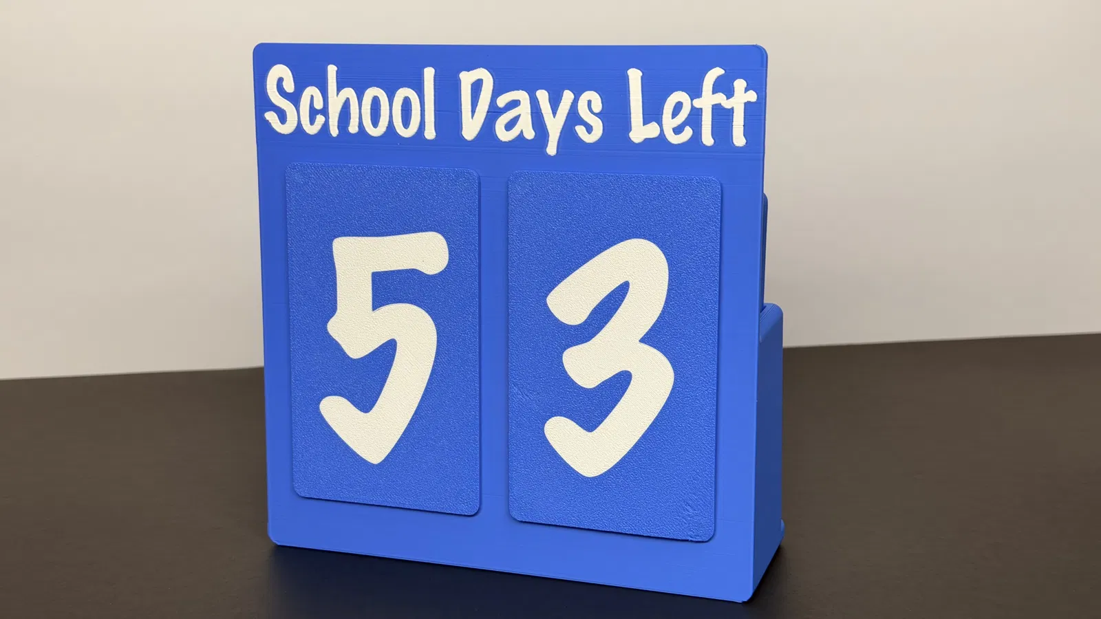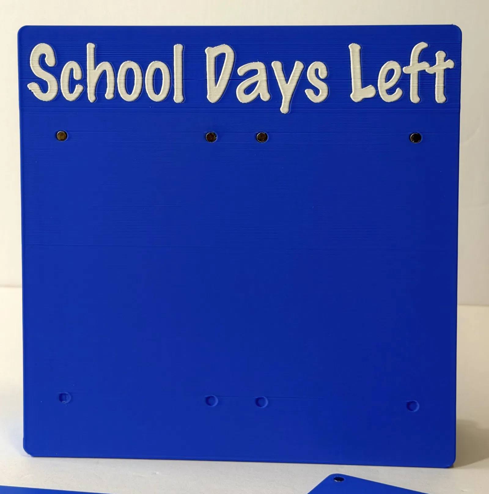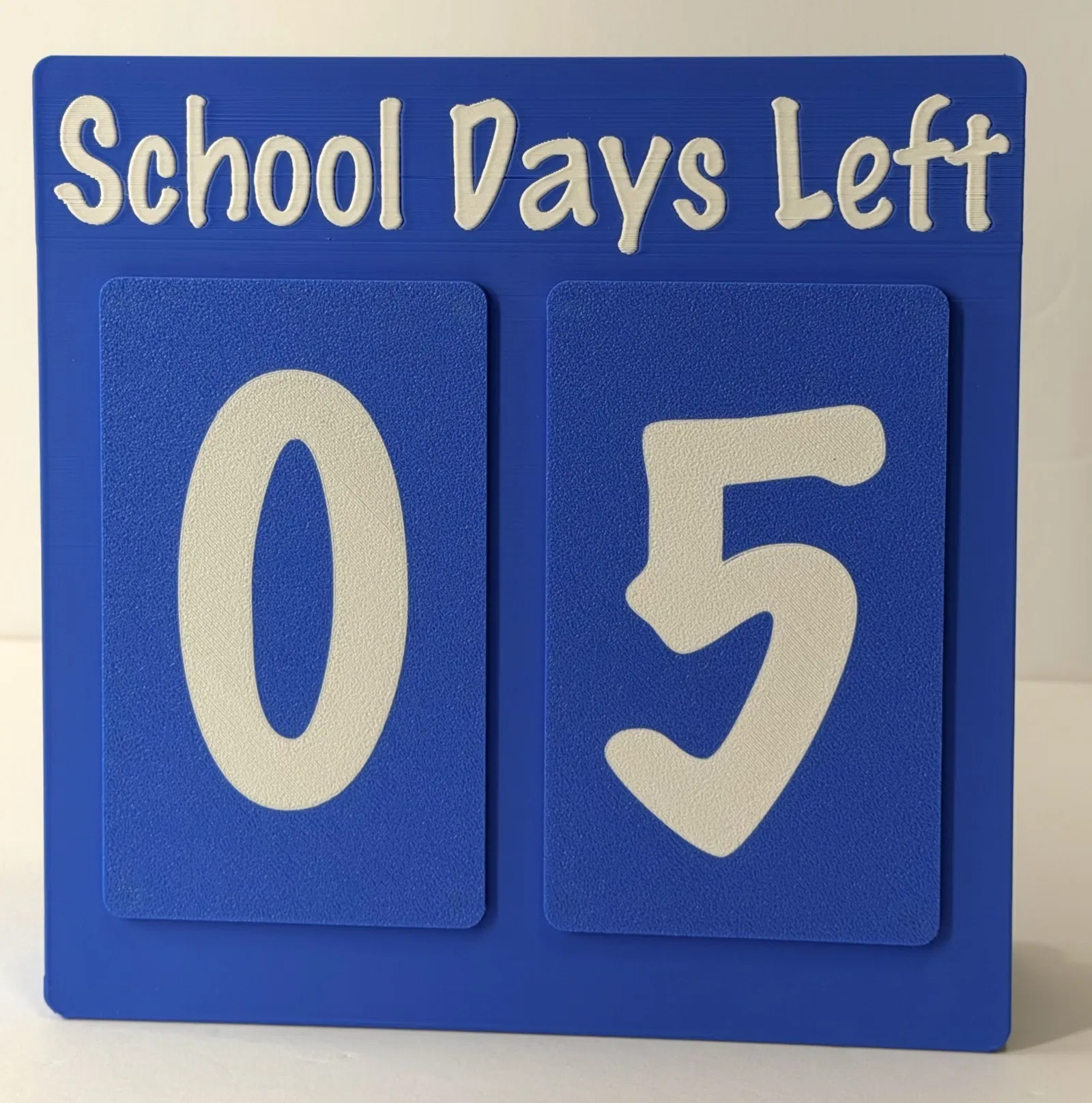 Bộ đếm ngược “Days of School Left” miễn phí từ R7Makers: tile số nam châm cầm đã tay, có ngăn chứa số 0–9 phía sau, in đẹp với textured PEI. Tối ưu nam châm 4mm x 1.5mm, PLA là lựa chọn ngon.