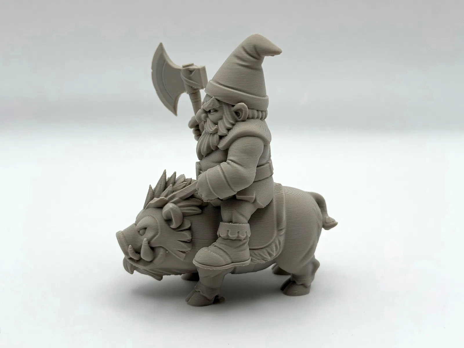 Mô hình Gnome Hog Rider: chiến binh gnome tí hon cưỡi hog lao vào trận chiến. File cần supports; dùng organic-style supports sẽ dễ bóc, và chỉnh Z-top height giúp tháo supports nhanh, sạch hơn khi in.