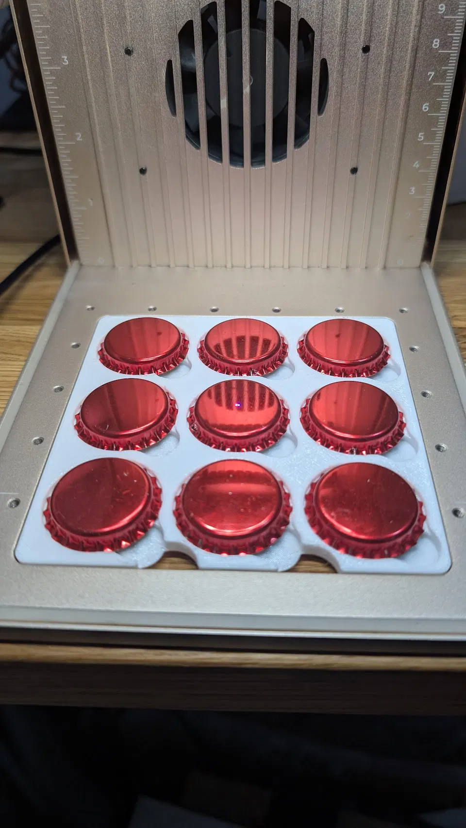Một cái jig đặt vừa vô base plate của Xtool F2 và giữ được 9 nắp chai bia (nắp chai bia 26mm).