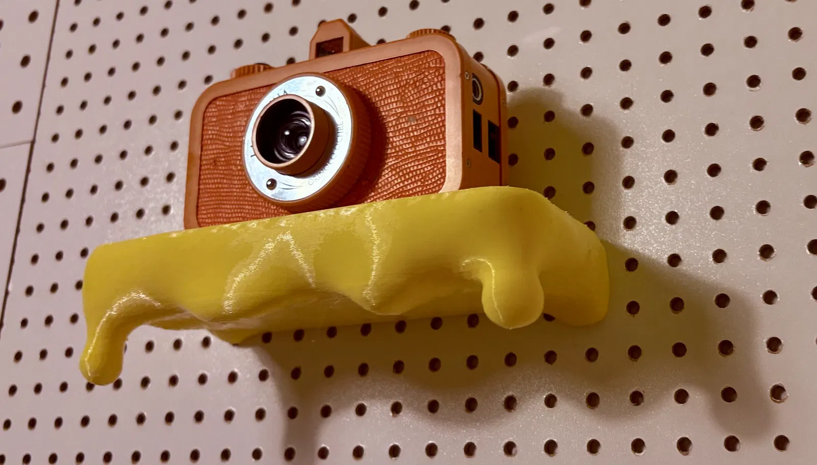 Đây là một cái kệ nhỏ để thêm chút màu sắc cho bức tường của bạn. Nó trông như sơn đang chảy nhỏ giọt, hoặc — tùy bạn in màu gì — có thể thành phô mai nóng chảy, máu, chất nhầy người ngoài hành tinh… muốn gọi sao cũng được. Kệ có sẵn các lỗ khoét để bắt treo cơ bản. Trên tường nhà mình, chỉ cần hai cây đinh là treo rất ổn. Mình không khuyến khích treo đồ quá nặng, nhưng như bạn thấy trong hình thì một cái máy ảnh nhỏ vẫn chịu tốt.