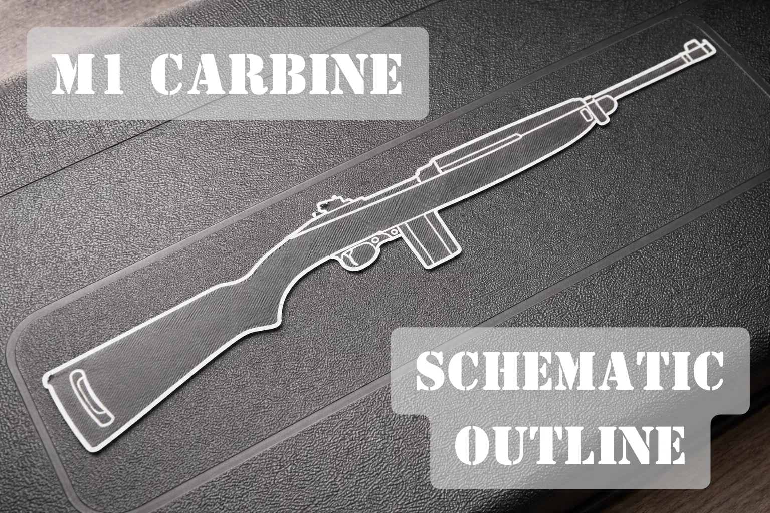 Phác thảo sơ đồ M1 Carbine dạng lineart sạch, đúng tỉ lệ. Thiết kế để in 2 màu (2 object), dễ đổi màu trong slicer, in PLA rất ổn. Dùng dán lên hộp đựng súng hoặc trang trí tường; chỉ mang tính trang trí, không chức năng.
