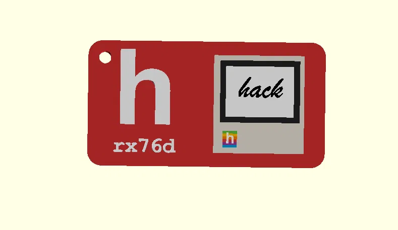 Mẫu móc khóa Hackclub x rx76d: một mặt là Macintosh, mặt kia là logo Hacklub kèm username. Hướng dẫn tạo STL bằng OpenSCAD và in 3 màu với các mốc đổi filament rõ ràng, không cần supports.