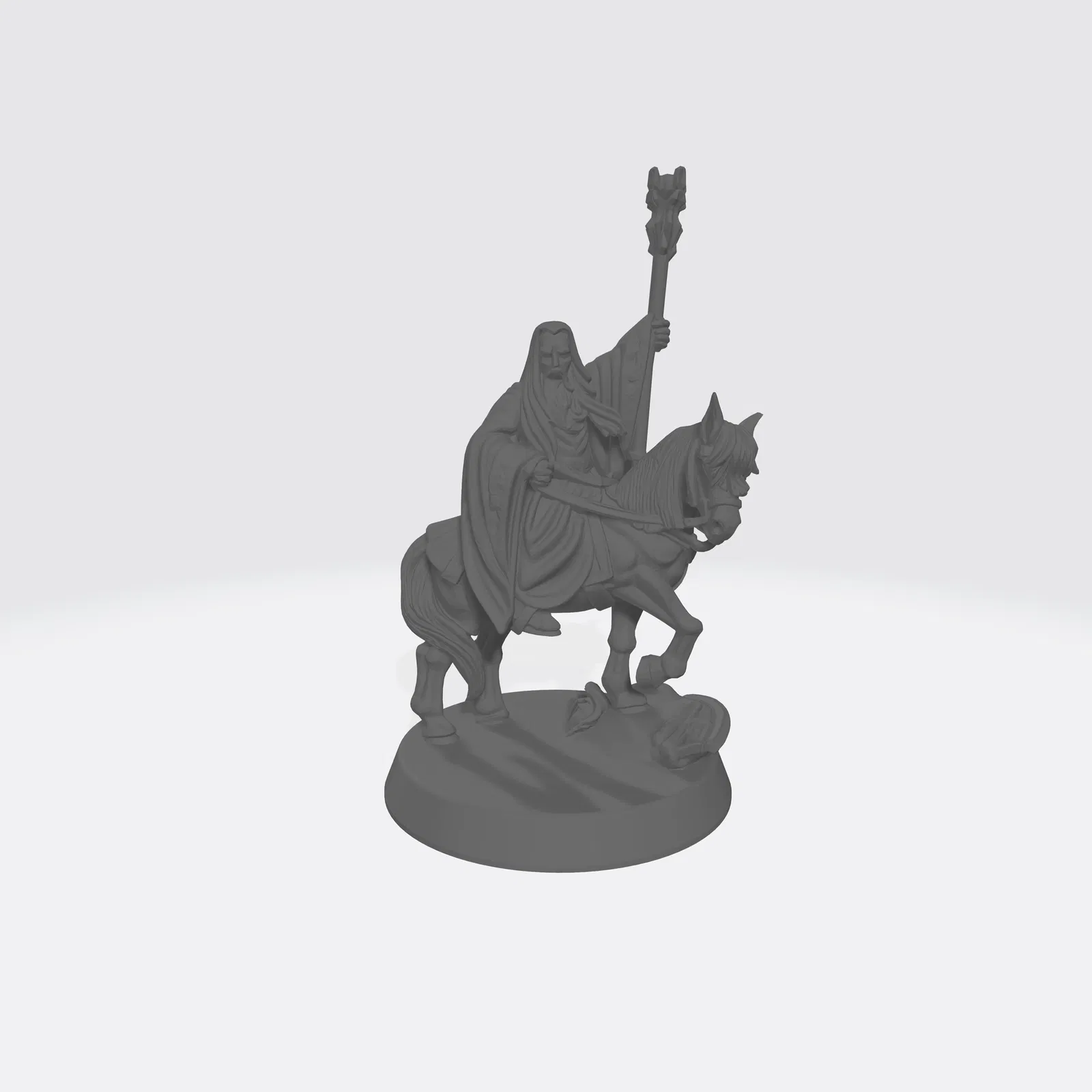Mô hình miniature Saruman (White Wizard) cưỡi ngựa, tay cầm trượng, lấy cảm hứng từ The Lord of the Rings. Thiết kế dùng đế 25mm, phù hợp để trưng bày hoặc chơi tabletop.