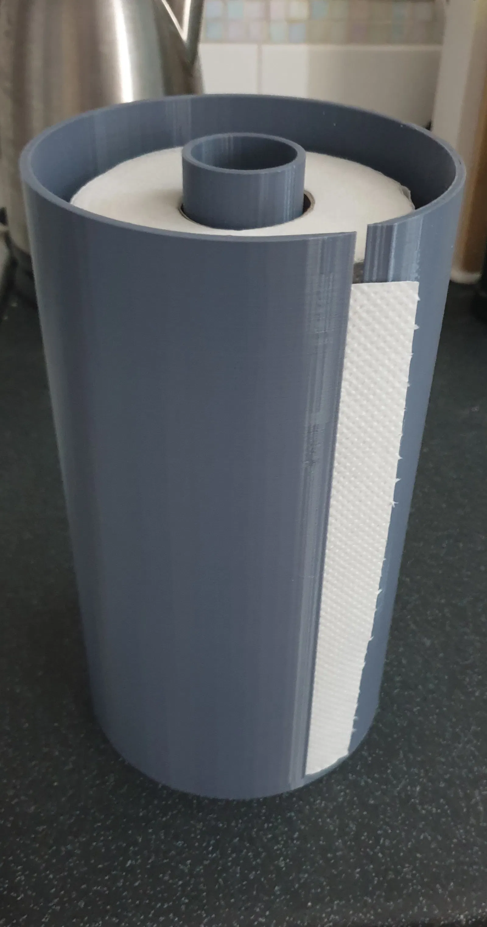 Giá đựng khăn giấy cuộn cho nhà bếp dạng có nắp: đặt cuộn vào trong và kéo khăn ra bên hông. Hỗ trợ cuộn đường kính ~12cm, cao ~22.5cm. Nên in layer 0.3mm+ với nozzle lớn để nhanh hơn.