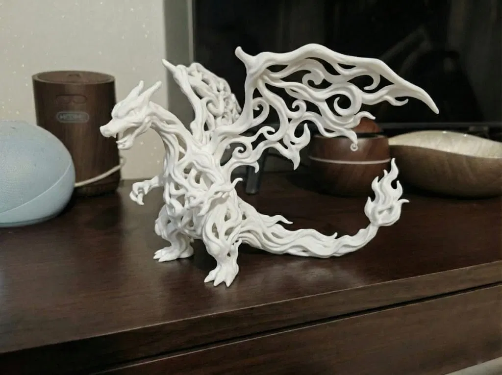 Phiên bản Charizard Voronoi với kết cấu lưới tạo hiệu ứng ánh sáng–bóng đổ nổi bật, nhìn như lửa đang chuyển động. Vừa mang chất Pokémon, vừa là thử thách kỹ thuật để kiểm tra độ chính xác máy in 3D của bạn.