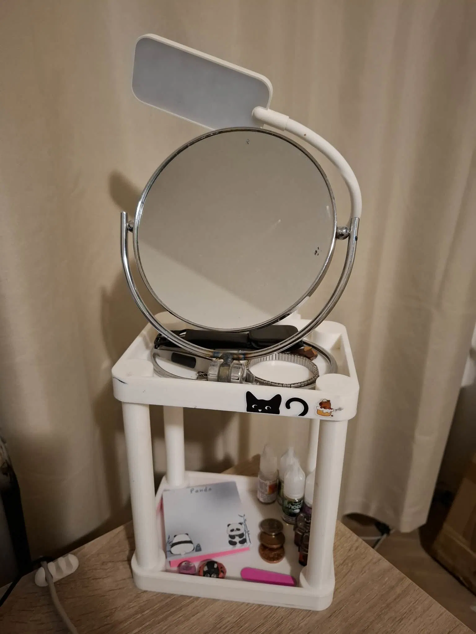 Kệ đựng mỹ phẩm đặt trên bàn, có chỗ để gắn thêm đèn. Lưu ý nên scale file “legs” xuống 99% do dung sai chưa chuẩn, giúp lắp ráp vừa khít và ổn định hơn.