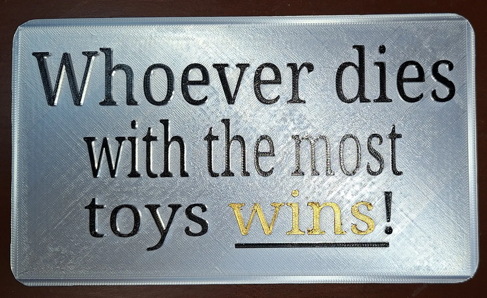 Mẫu bảng chữ “Ai chết mà có nhiều đồ chơi nhất thì thắng.” Mình vẫn giữ quan điểm đó. Thiết kế đơn giản để in 3D, có rãnh gắn nam châm 3x8mm để treo/dán lên bề mặt kim loại gọn gàng.