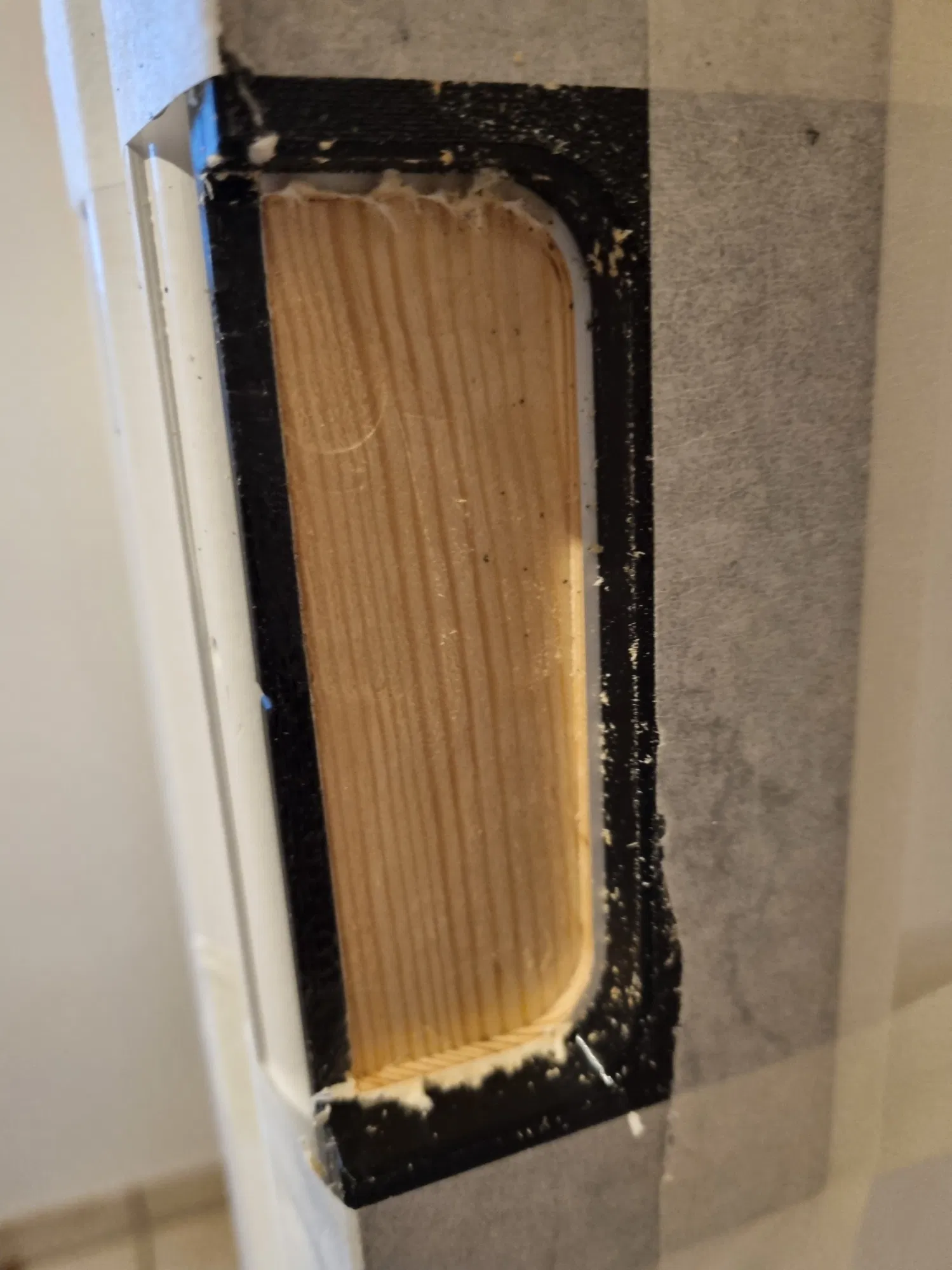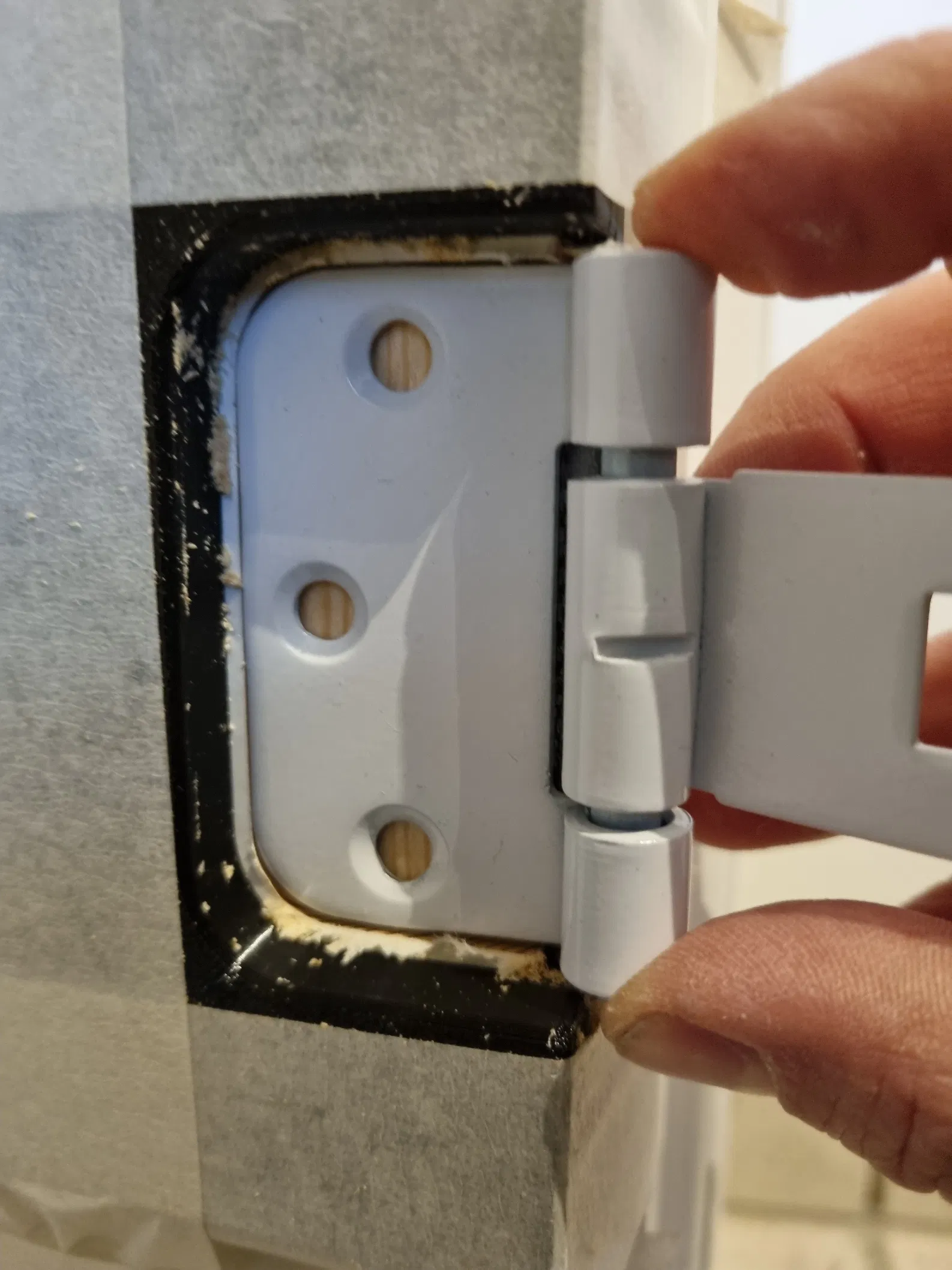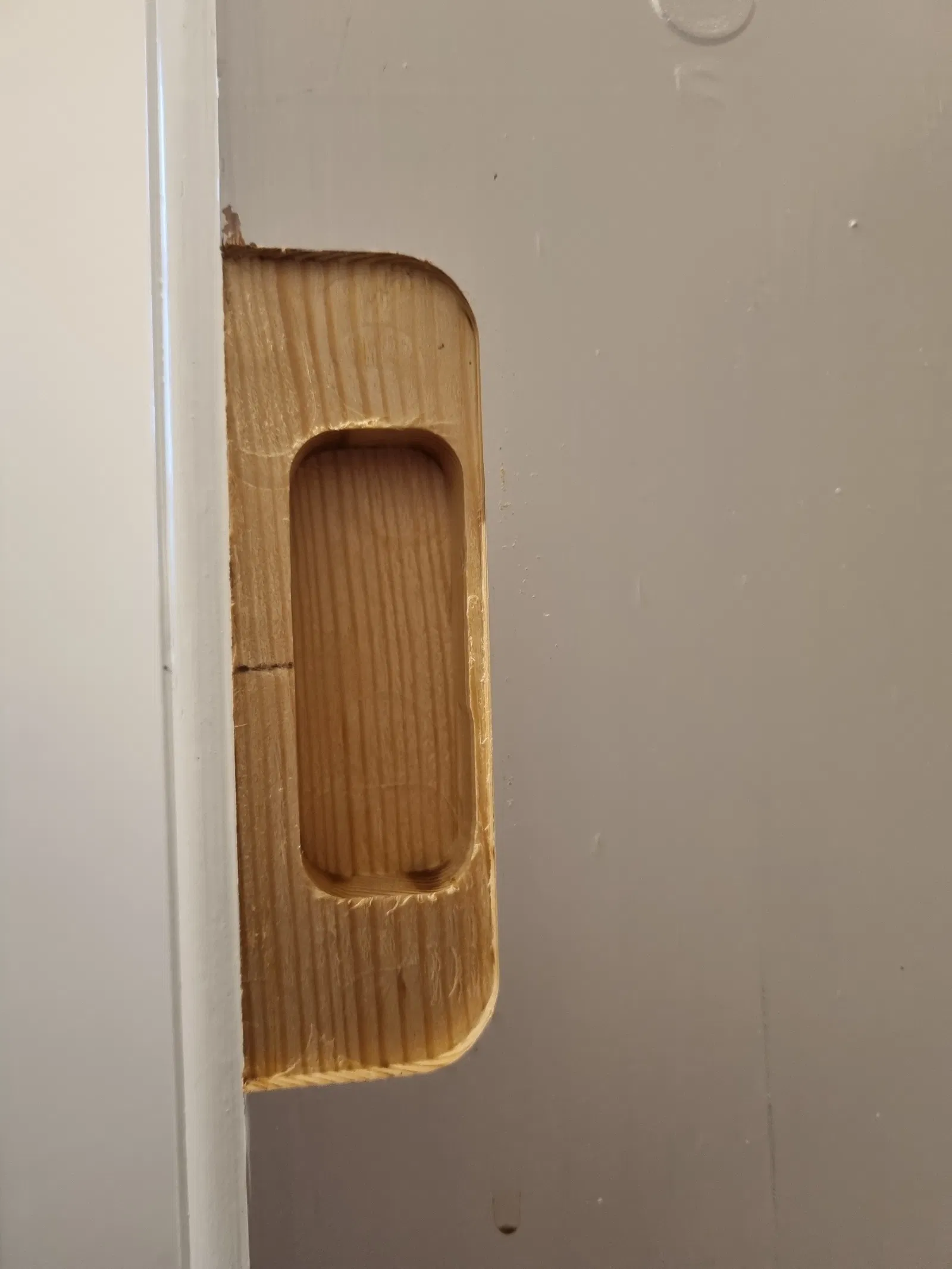 Bối cảnh: Tụi mình lắp một cái cửa vào khung gỗ vốn không được làm để gắn cửa, nên phải phay/cắt các rãnh cho bản lề và miếng đối/striking plate (slutblik) trên khung. Ngoài ra còn phải phay trên cánh cửa, nên phần khoét cho bản lề trên cửa cũng cần làm luôn.
