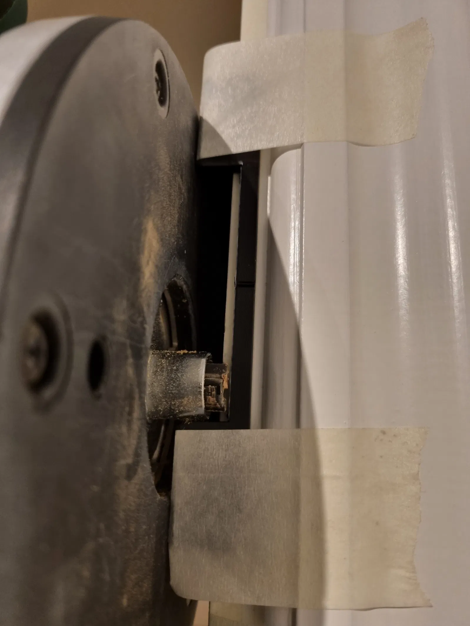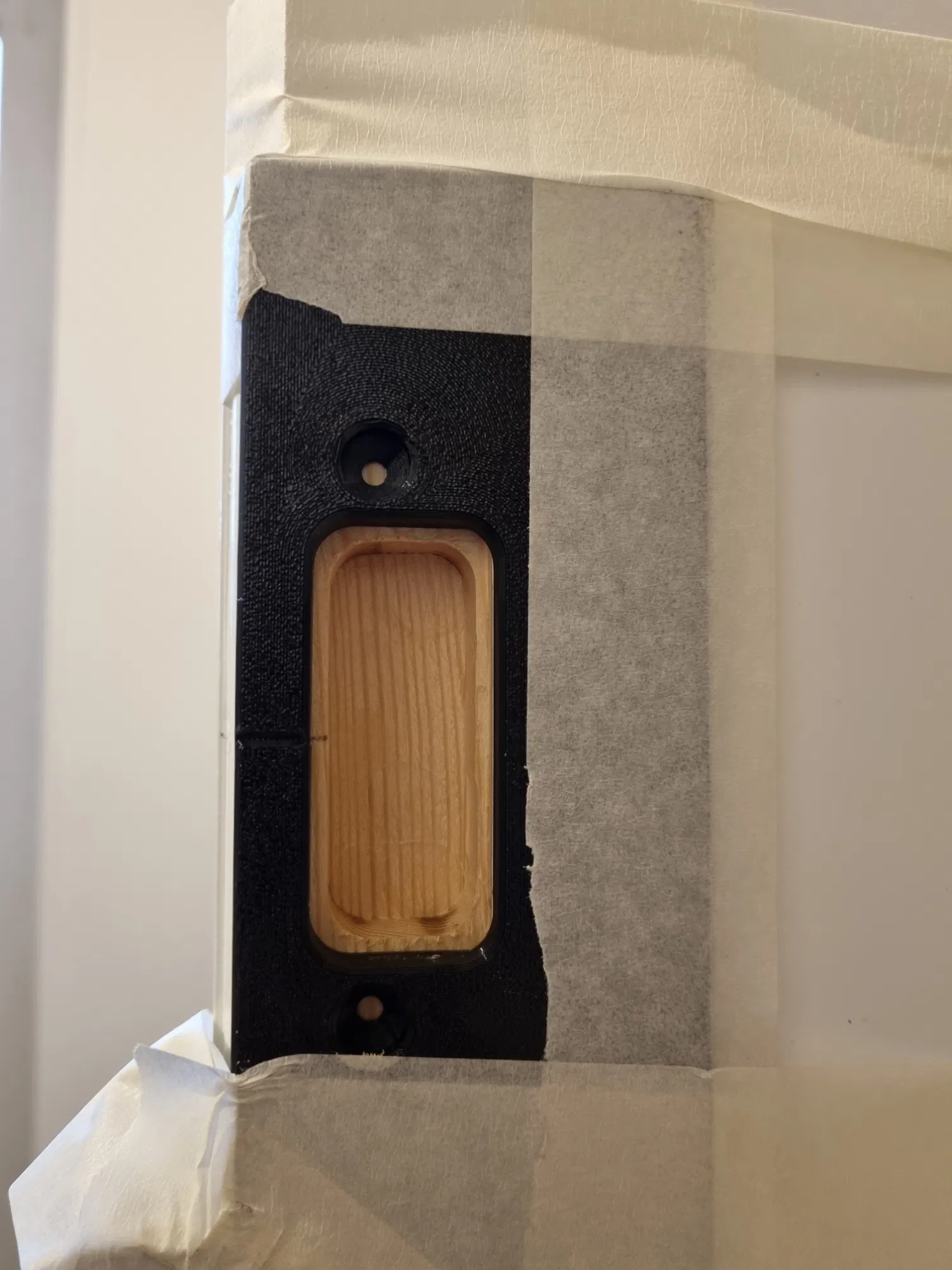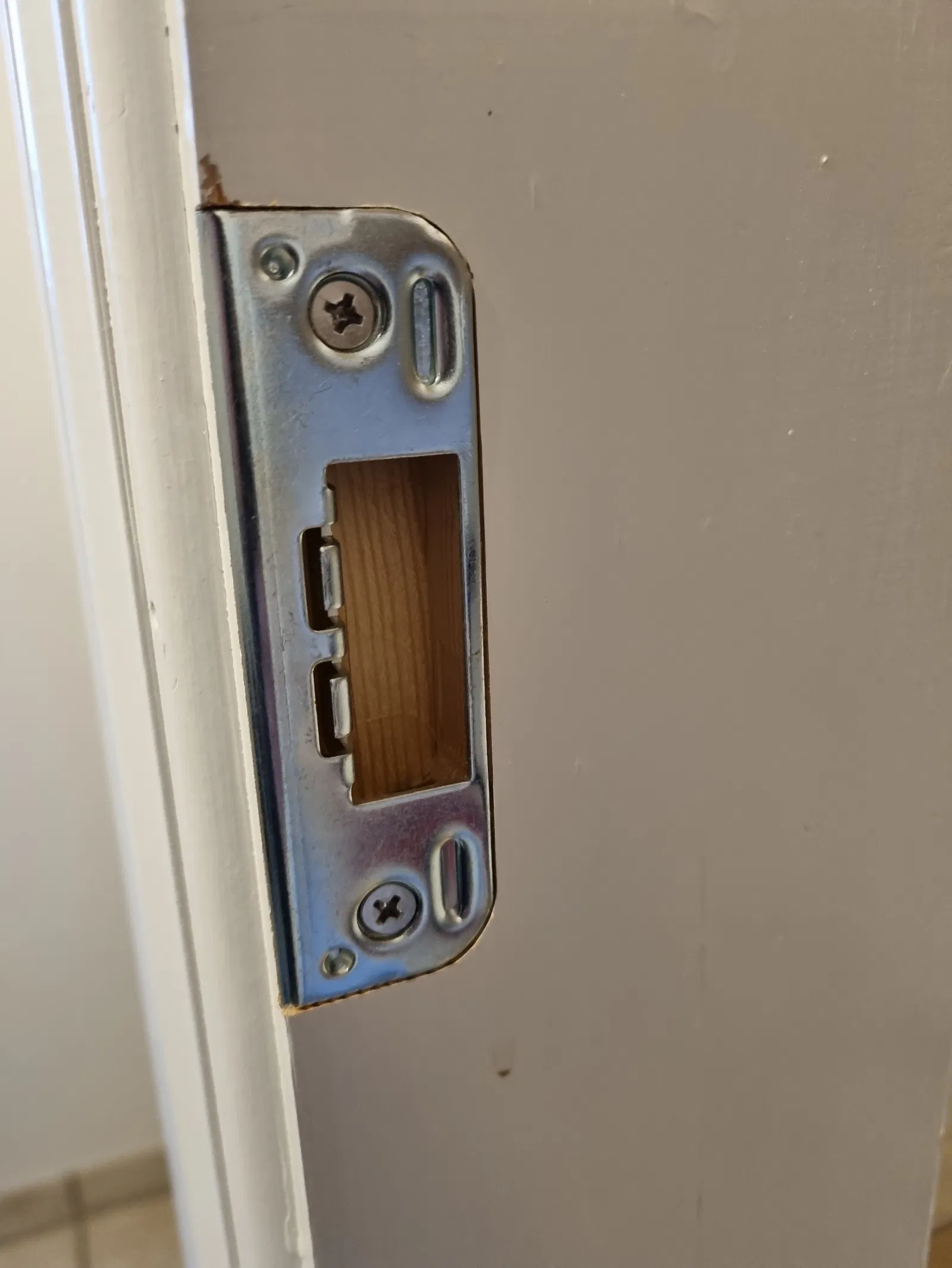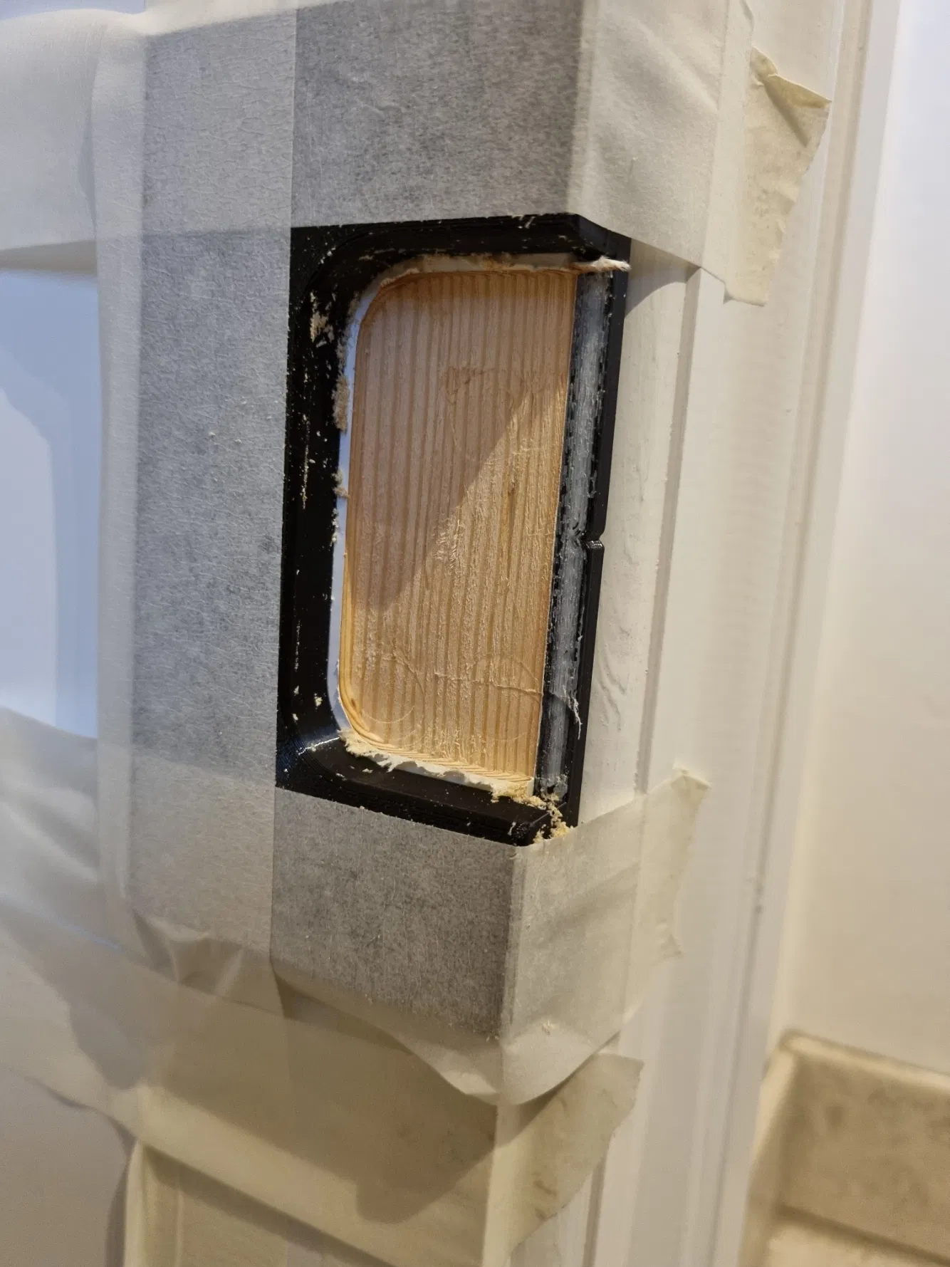Bối cảnh: Tụi mình lắp một cái cửa vào khung gỗ vốn không được làm để gắn cửa, nên phải phay/cắt các rãnh cho bản lề và miếng đối/striking plate (slutblik) trên khung. Ngoài ra còn phải phay trên cánh cửa, nên phần khoét cho bản lề trên cửa cũng cần làm luôn.