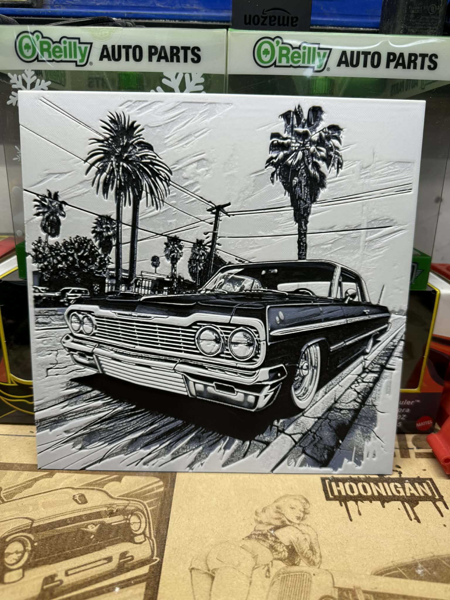 Mẫu in 3D này tái hiện đúng “chất” của chiếc Impala 1963 cổ điển, kết hợp kiểu khắc nghệ thuật với các chi tiết tả thực. Bề mặt texture giúp tổng thể nhìn nổi và đã mắt hơn, còn hàng dừa phía sau tạo cảm giác rất “California”.