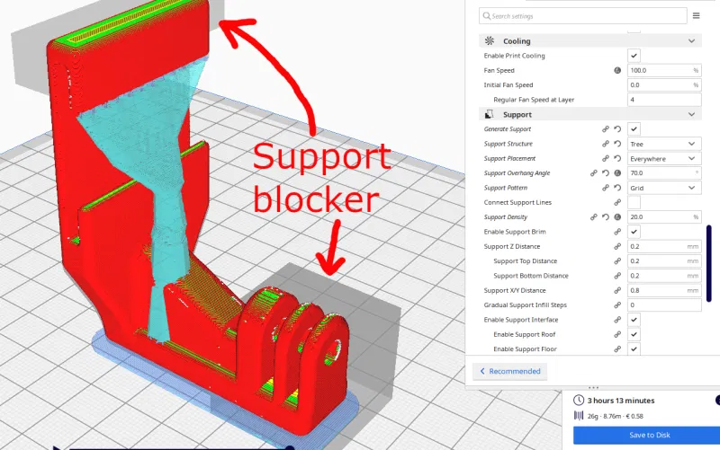 Không hiểu sao mình không làm cho tree support mọc từ build plate được; ở các bản trước thì chạy ngon, nhưng tới bản final evolution 4 này thì không được. Kể cả khi đặt 'support placement' là 'touching buildplate' cũng vậy. Nhưng với thông số support như trong hình thì support gỡ ra rất dễ! Bạn có thể không cần support cho các lỗ bắt vít (tùy chất lượng máy in của bạn)!