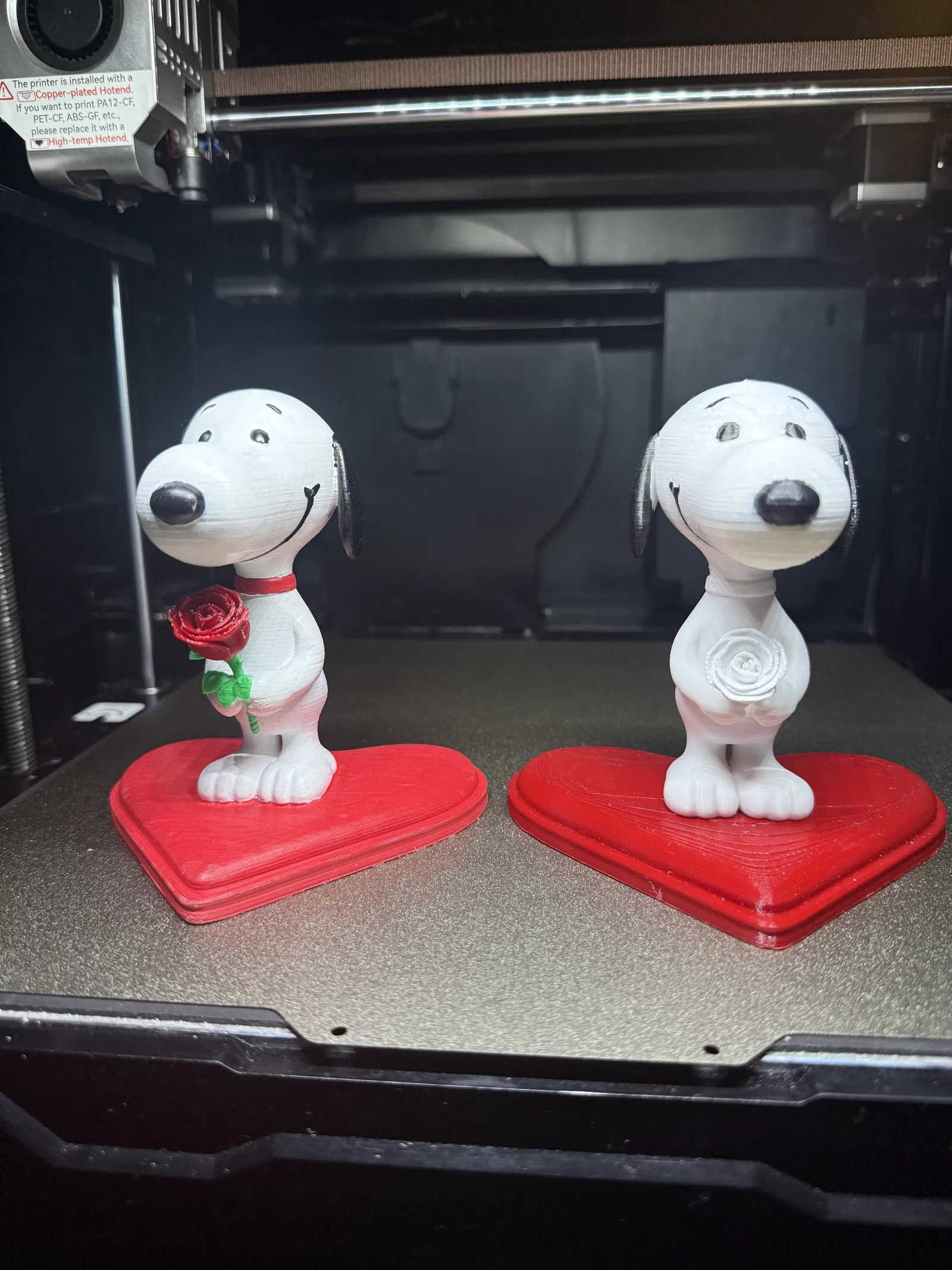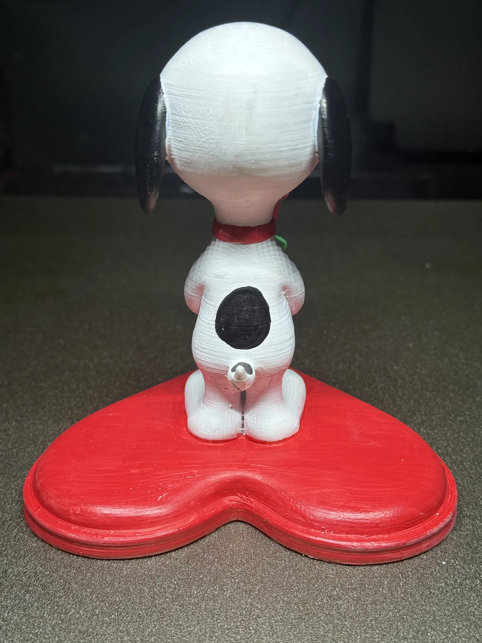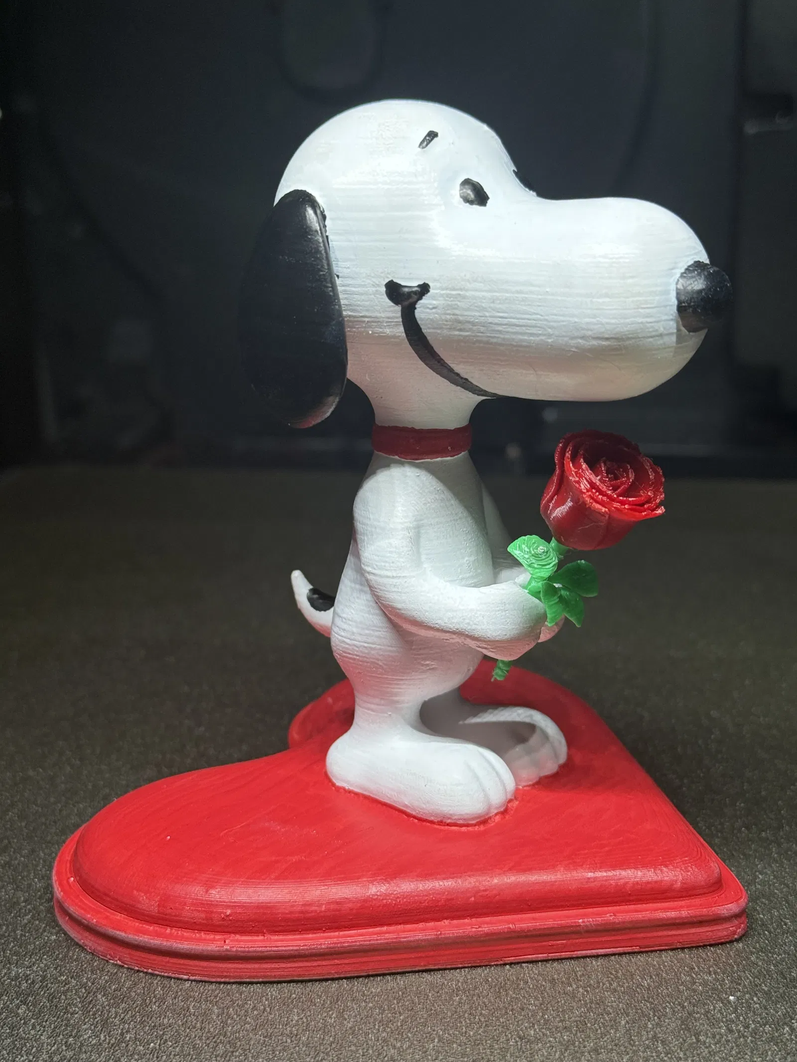 Tượng phong cách Snoopy cao 4.8” đứng trên đế trái tim, in bằng PLA+ và sơn tay tỉ mỉ với tông đen–trắng–đỏ. Có chi tiết hoa hồng lãng mạn, hợp trưng bày Valentine hoặc làm quà tặng.
