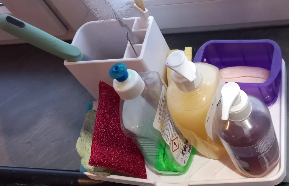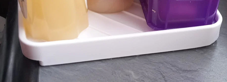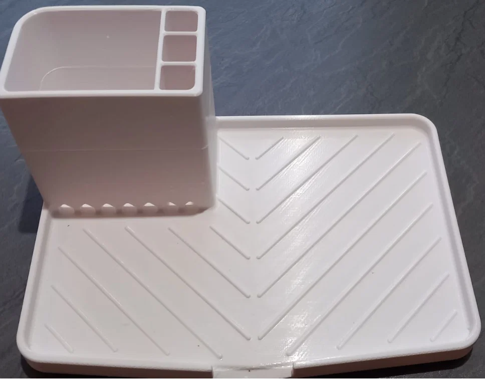 Organizer cho khay thoát nước bồn rửa bếp, dùng để để miếng bọt biển, nước rửa chén và bàn chải. Có 2 phiên bản: có bậc 8,5mm cho bồn rửa lắp cao và bản không bậc; kèm supports để in nghiêng cho bề mặt mịn hơn.