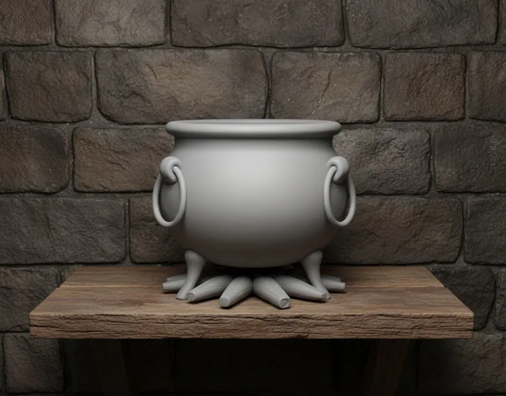 Mẫu 3D “vạc phù thủy đang cháy lửa”, hợp để trang trí chủ đề Halloween, làm tượng/figurine hoặc đạo cụ bàn game. Thiết kế mô phỏng chiếc cauldron của witch với ngọn lửa bùng lên nổi bật.