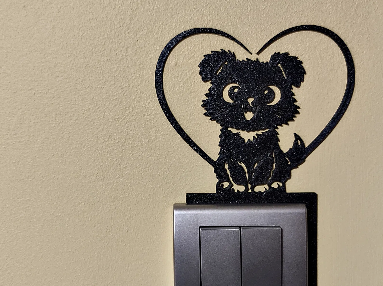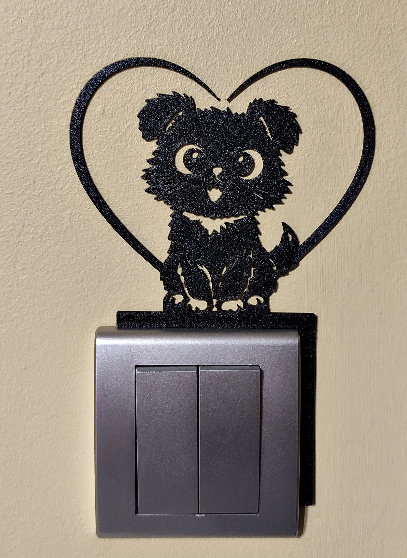 “Love Puppy” là mẫu topper trang trí cho công tắc đèn in 3D, giúp “lột xác” bức tường ngay tức thì. Chú cún dễ thương nằm trong khung trái tim tạo thành món decor chuẩn Valentine, mà để quanh năm vẫn hợp mắt.