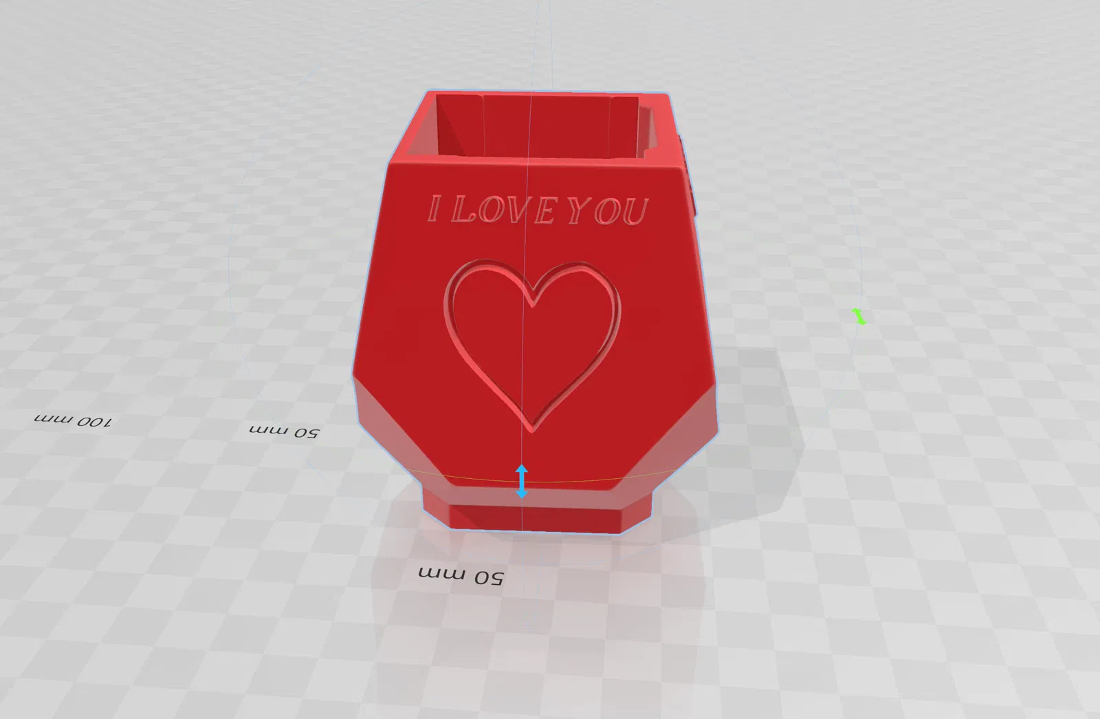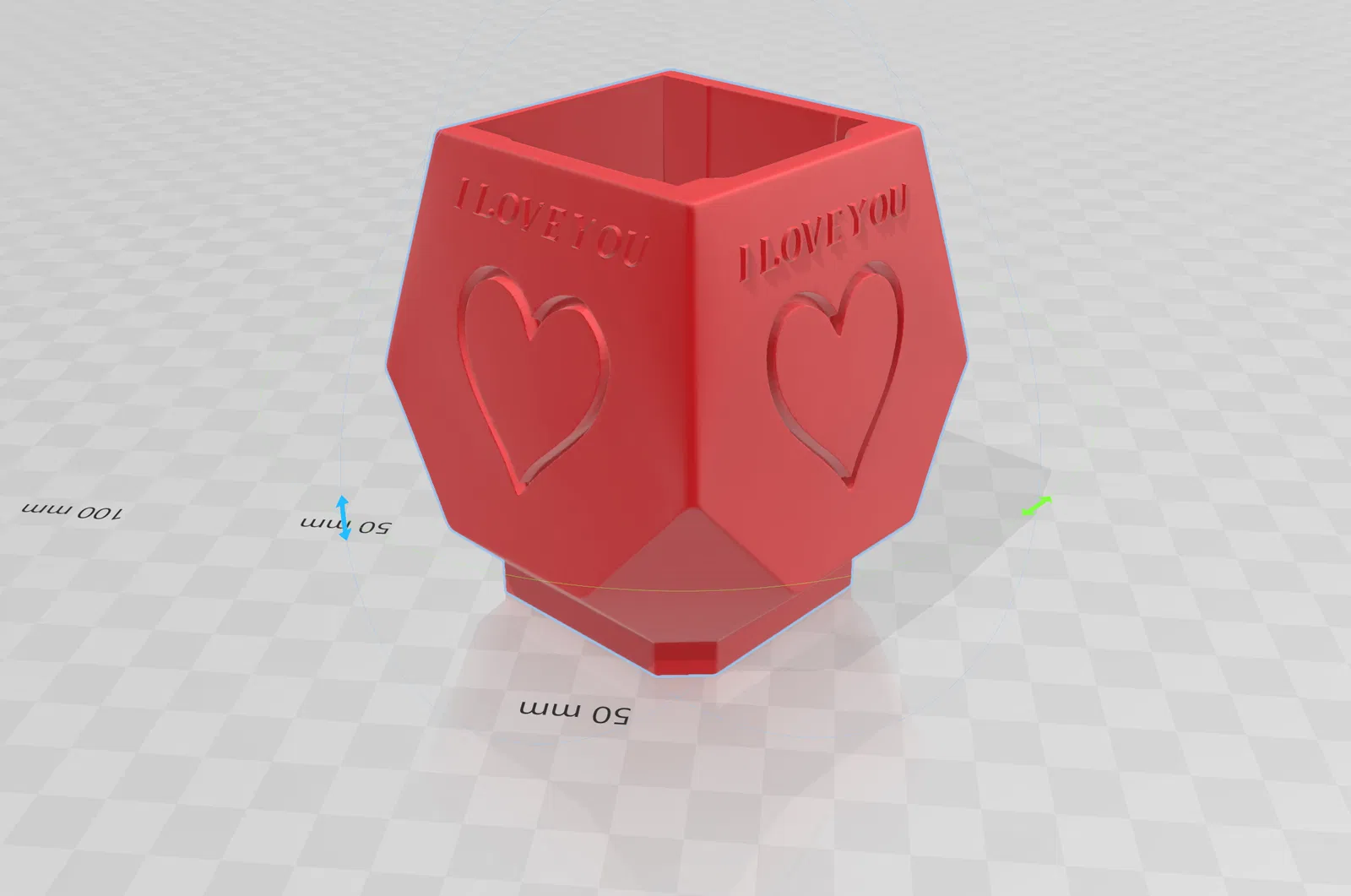 Ống đựng bút/ bút chì thiết kế lãng mạn với chữ “I LOVE YOU” và họa tiết trái tim khoét rỗng. Dáng đáy bát giác, miệng vuông rộng, để gọn khoảng 8–15 cây bút. Khuyến nghị in PLA hoặc PTG, màu đỏ đậm nổi bật.