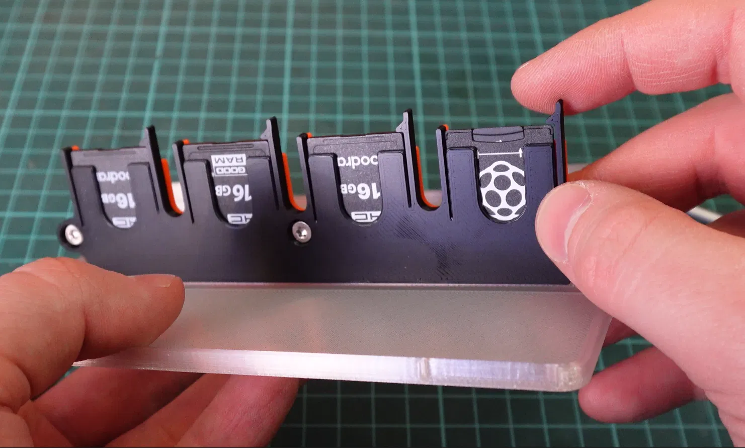 Ví đựng thẻ SD dạng flex nhỏ gọn, chứa được 4 thẻ SD, tiện mang theo khi đi quay/chụp. In PETG cho phần hộp và PLA cho khay giữ thẻ, lắp bằng 3 vít M3x5.