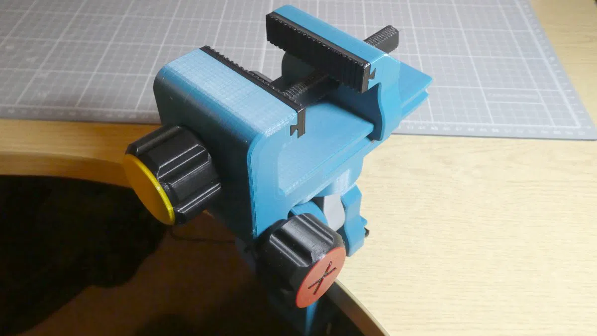 Mẫu Three Axis Table Vise 100% printable, kẹp bàn tối đa 40mm, xoay/nghiêng 3 trục như “tay thứ ba”. Khớp răng-ngàm khóa chắc theo nấc (X/Z 15°, Y 10°). STL set sẵn, in PETG 0.2mm, không cần supports.