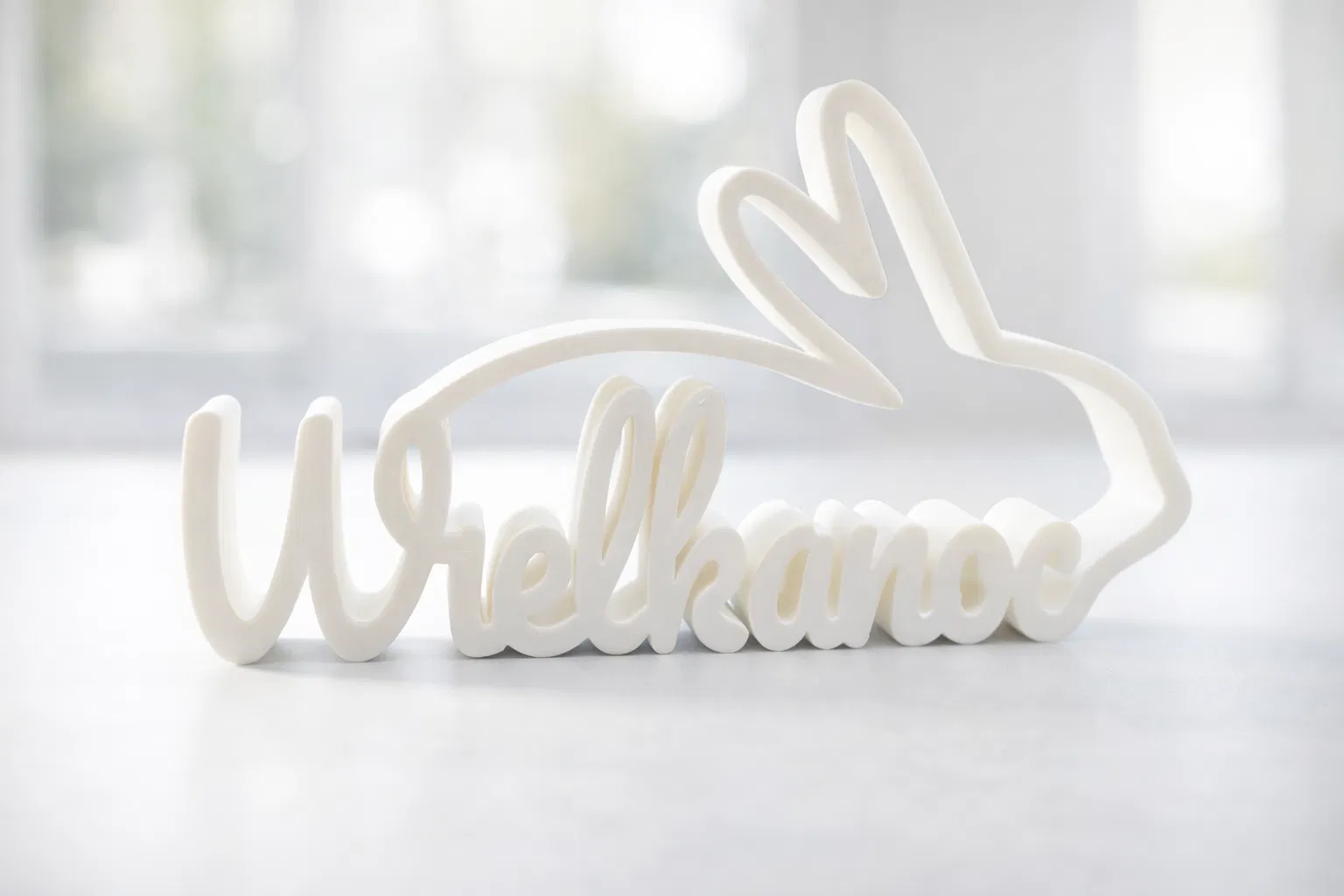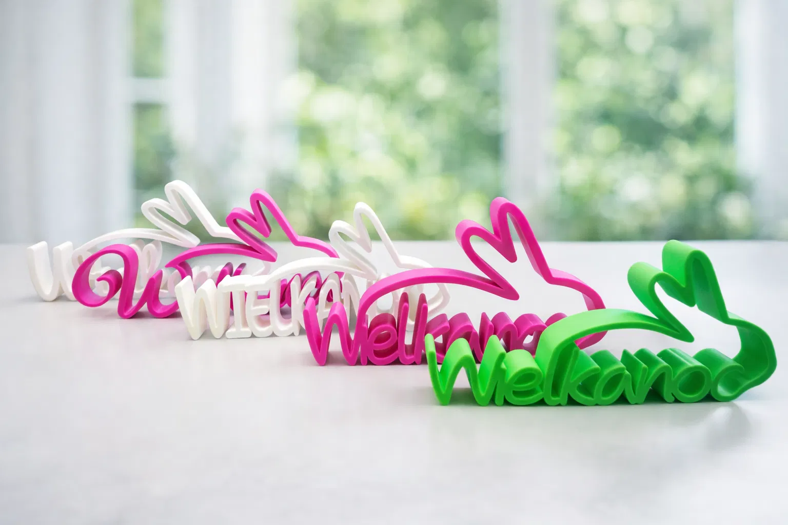 Mẫu chữ 3D “Wielkanoc” (Phục Sinh) tối giản với tai thỏ, gồm 5 kiểu thiết kế. In FDM dễ, không cần support, đứng vững, hợp decor bàn/kệ/tủ trưng bày; đẹp khi in PLA một màu hoặc nhiều màu.