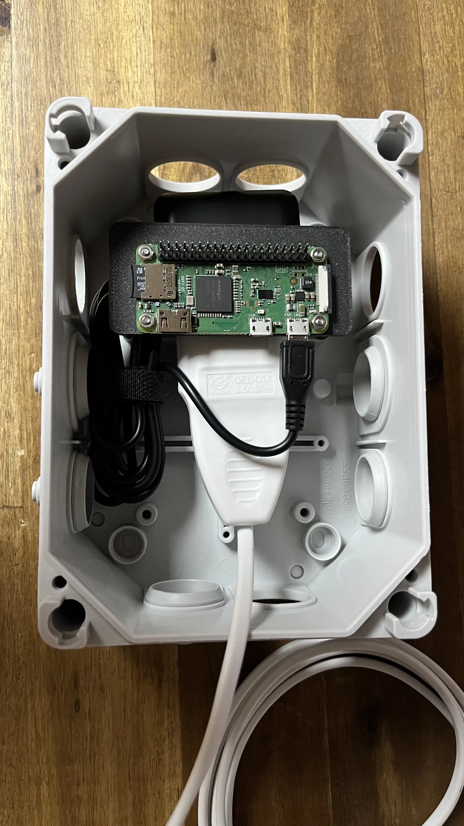 Bệ đỡ để lắp PI Zero 2W chắc chắn trong hộp điện/Verbindungsdose bằng bộ nguồn. Thiết kế bấm khớp vào các lỗ có sẵn trong hộp, giúp cố định gọn gàng và ổn định khi lắp đặt.