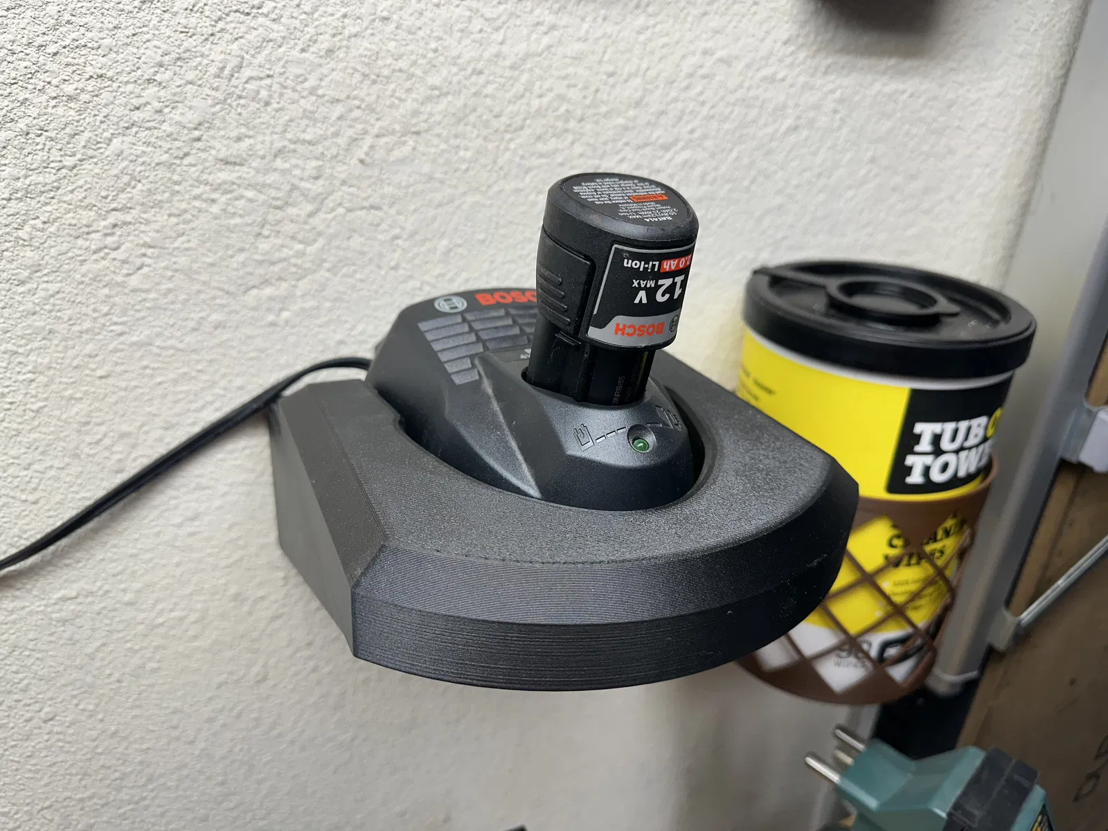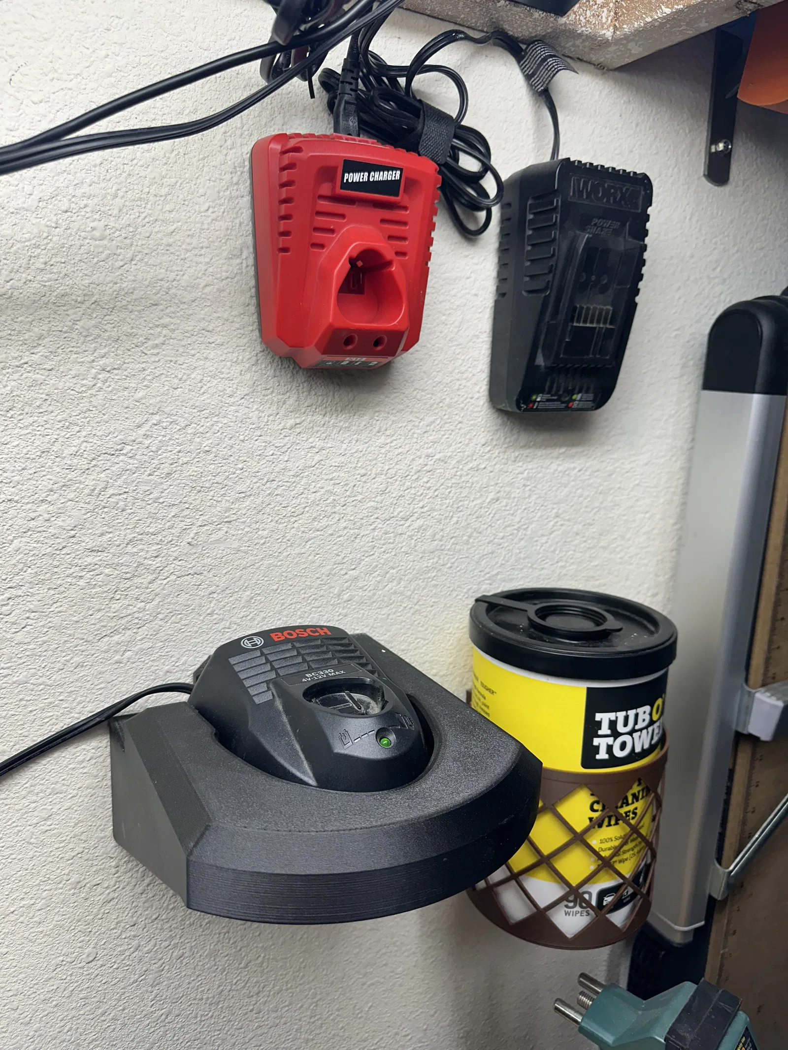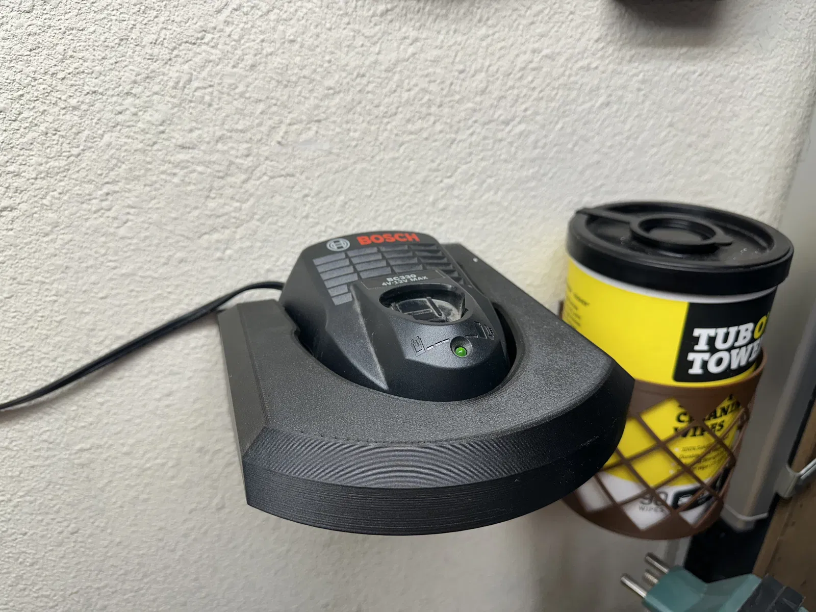 Mình đang kiếm một cái bracket để gắn sạc Bosch BC330 lên tường trong gara. Mấy mẫu mình tìm được thì đều thiết kế để gắn theo chiều dọc. Có hai vấn đề với cách này vì bộ sạc vốn không được thiết kế cho kiểu sử dụng đó: (a) pin không được giữ chắc và có thể rớt; và (b) các lỗ thông gió chỉ nằm ở phía dưới và phía trên, nên khi vận hành có thể không được làm mát đúng cách. Nếu bộ sạc cho phép dùng theo chiều dọc thì nó đã có sẵn các lỗ bắt vít tương ứng. Nhưng thực tế là không có.
