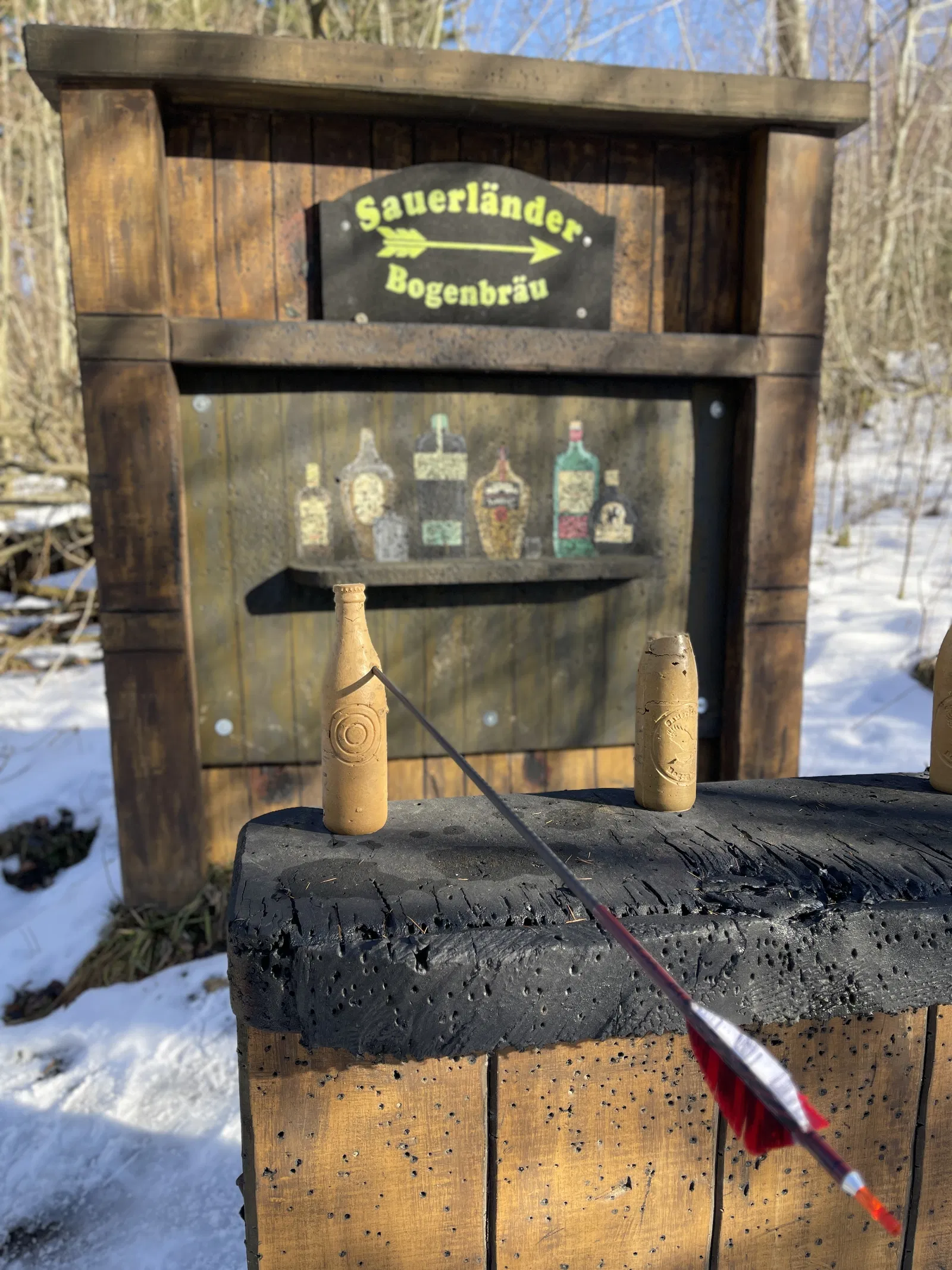 Ở pacours của tụi mình, cuối sợi dây có gắn một cục nặng, để khi bị bắn trúng thì chai bị hất văng đi nhưng không bay quá xa.