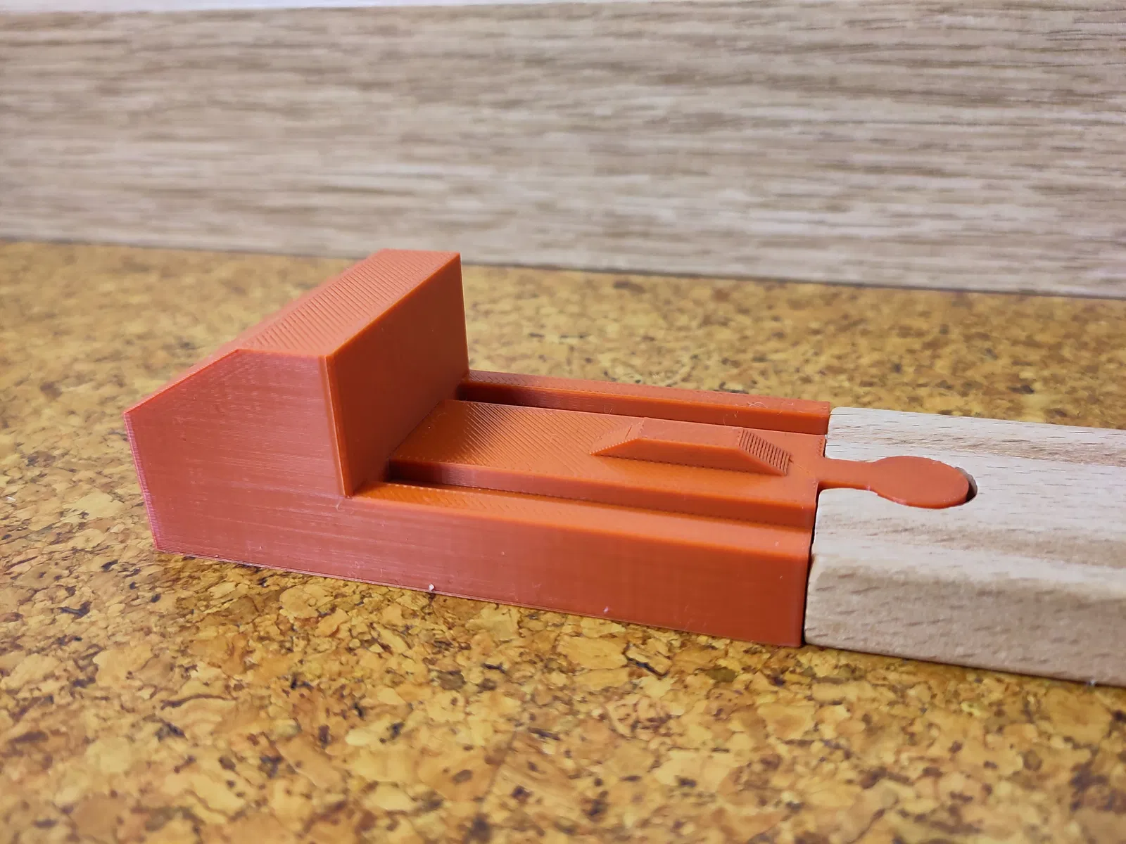 Khối chặn dừng tàu tương thích Brio có gờ (threshold) để kích hoạt cảm biến dưới gầm đầu máy, giúp tàu tự động dừng trước khối chặn. Đã test với BRIO World 33214 Batterie-Frachtlok. In PLA, 2 walls, infill 15%.