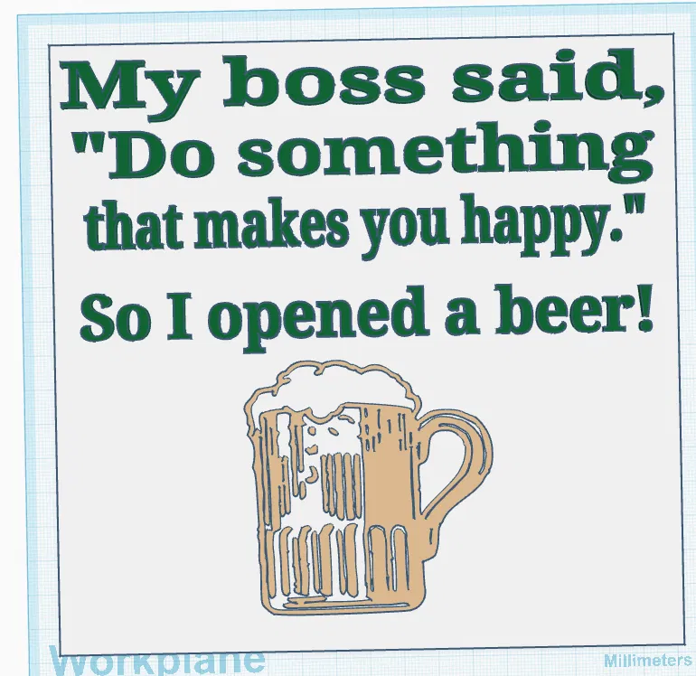 Mẫu bảng hiệu “Opening a Beer” được thiết kế bằng Tinkercad, phù hợp để in 3D trang trí quầy bar, góc chill hoặc không gian giải trí. Bạn có thể tùy chỉnh kích thước, chữ và màu sắc theo ý thích.