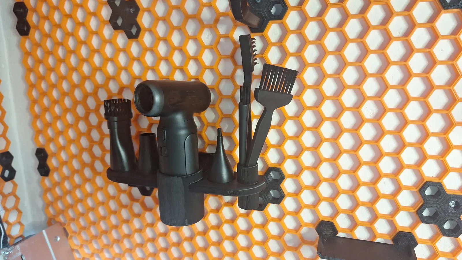 Holder gắn HSW để treo máy thổi bụi điện ZARM lên Honeycomb Storage Wall, có ngăn riêng cho 3 nozzle và 3 bàn chải. Có 2 phiên bản khác ngoại hình, kèm file Fusion 360 để chỉnh sửa khi cần.