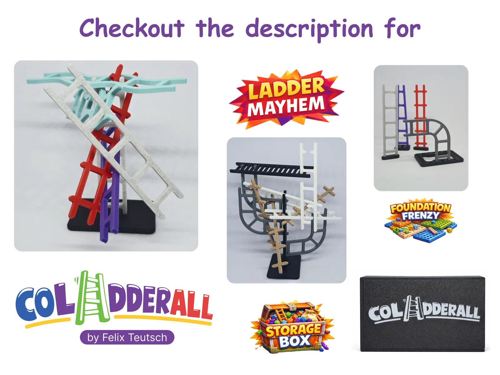 Tất cả base plate đều được thiết kế để hoạt động mượt mà với mọi ladder từ bản game gốc và tất cả các bản mở rộng. Chúng cũng tương thích hoàn toàn với hộp lưu trữ Coladderall, nghĩa là mọi thứ — base game, Ladder Mayhem, và Foundation Frenzy — đều xếp gọn chung trong một bộ hoàn chỉnh.