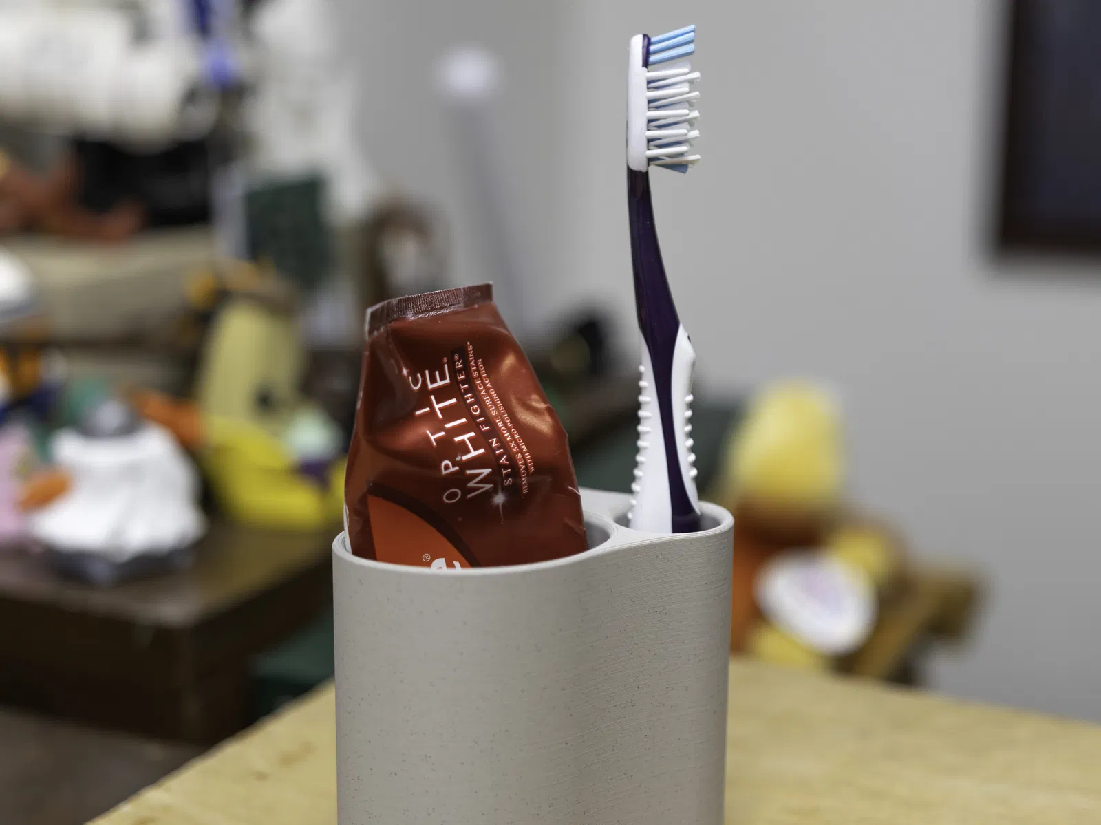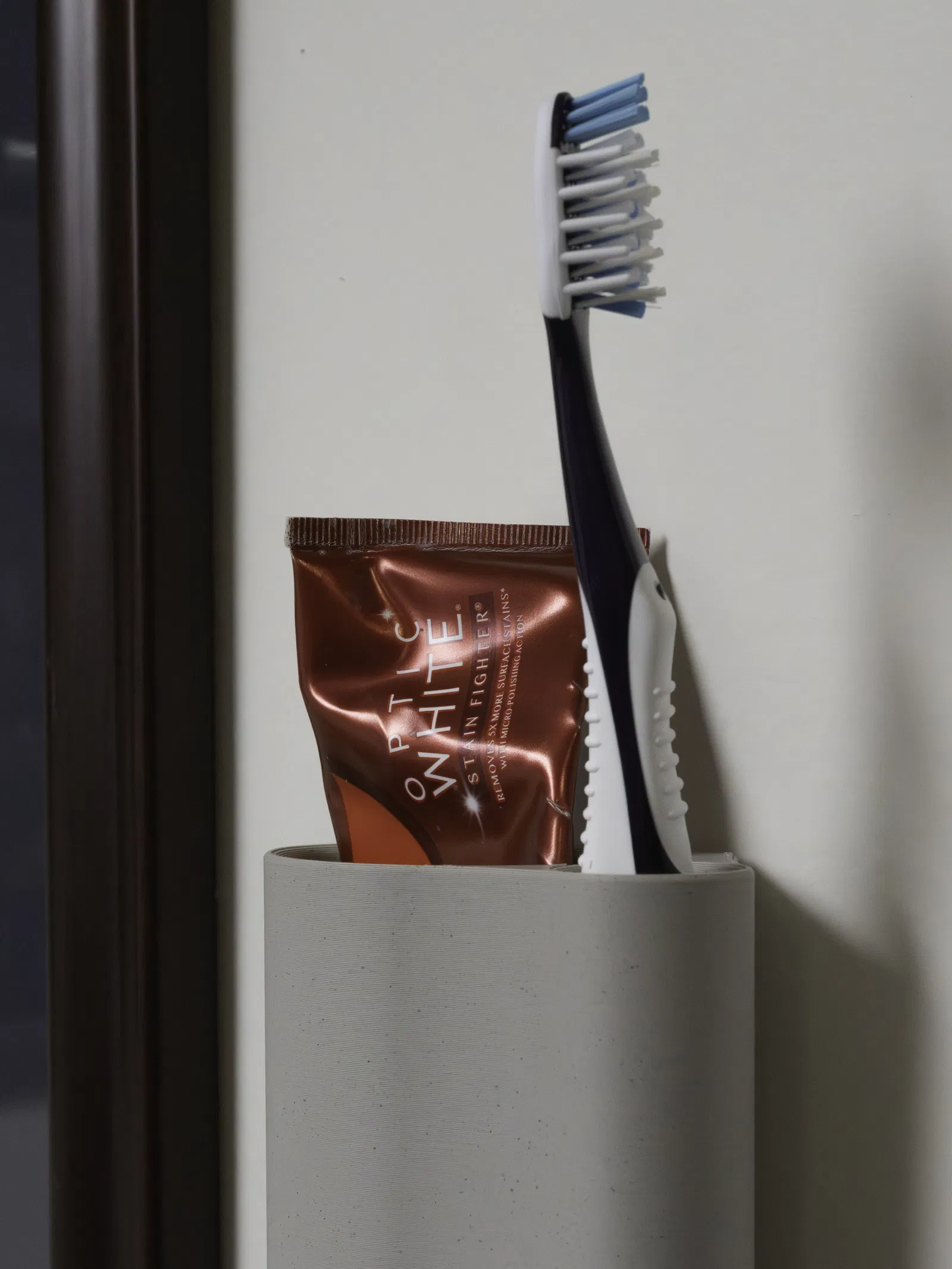 Đây là phiên bản mỏng (slim) của mẫu giá đỡ kem đánh răng/bàn chải đánh răng mà mình làm. Mẫu này được thiết kế đúng với kích thước kem đánh răng và bàn chải mình đang dùng. Dù vậy, khả năng cao là nó cũng sẽ hợp với nhiều loại khác.