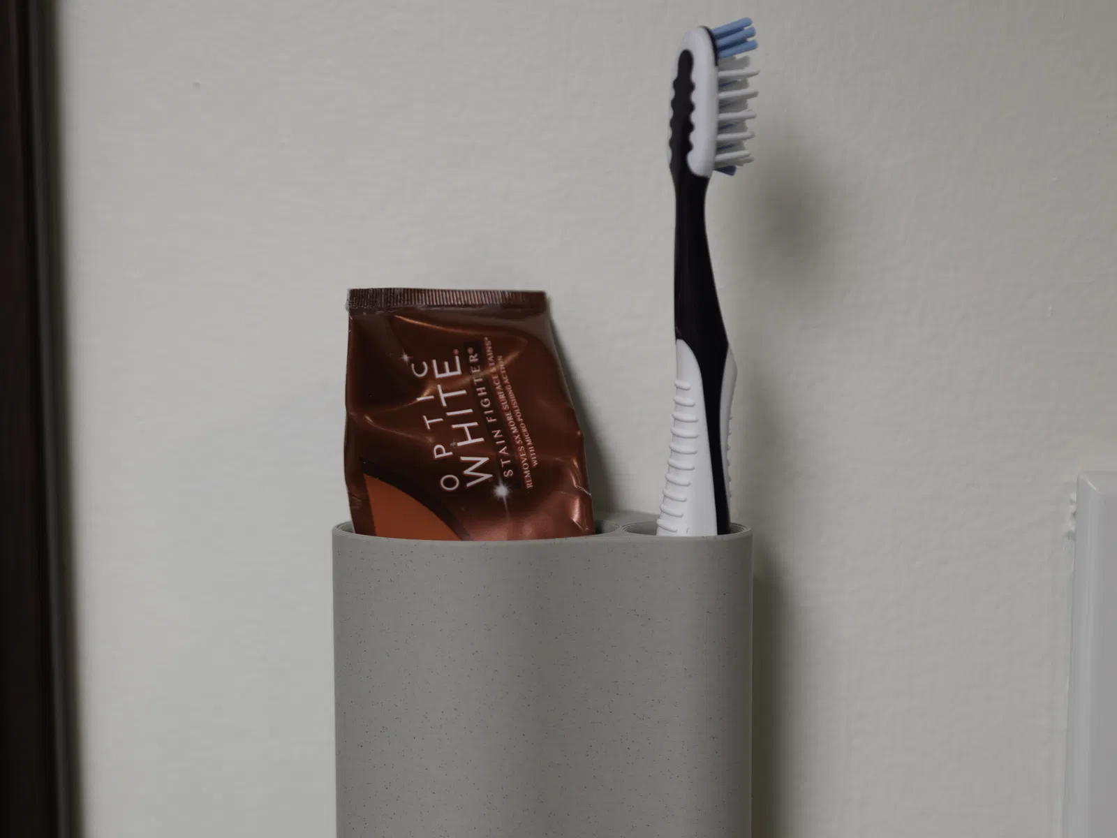 Phiên bản slim của giá đỡ kem đánh răng/bàn chải gắn tường, dùng command strip cỡ medium. Thiết kế sát tường, chịu tải khoảng 5lbs (~2.2kg). In PLA/filament tuỳ chọn, không cần supports, layer height 0.2mm.
