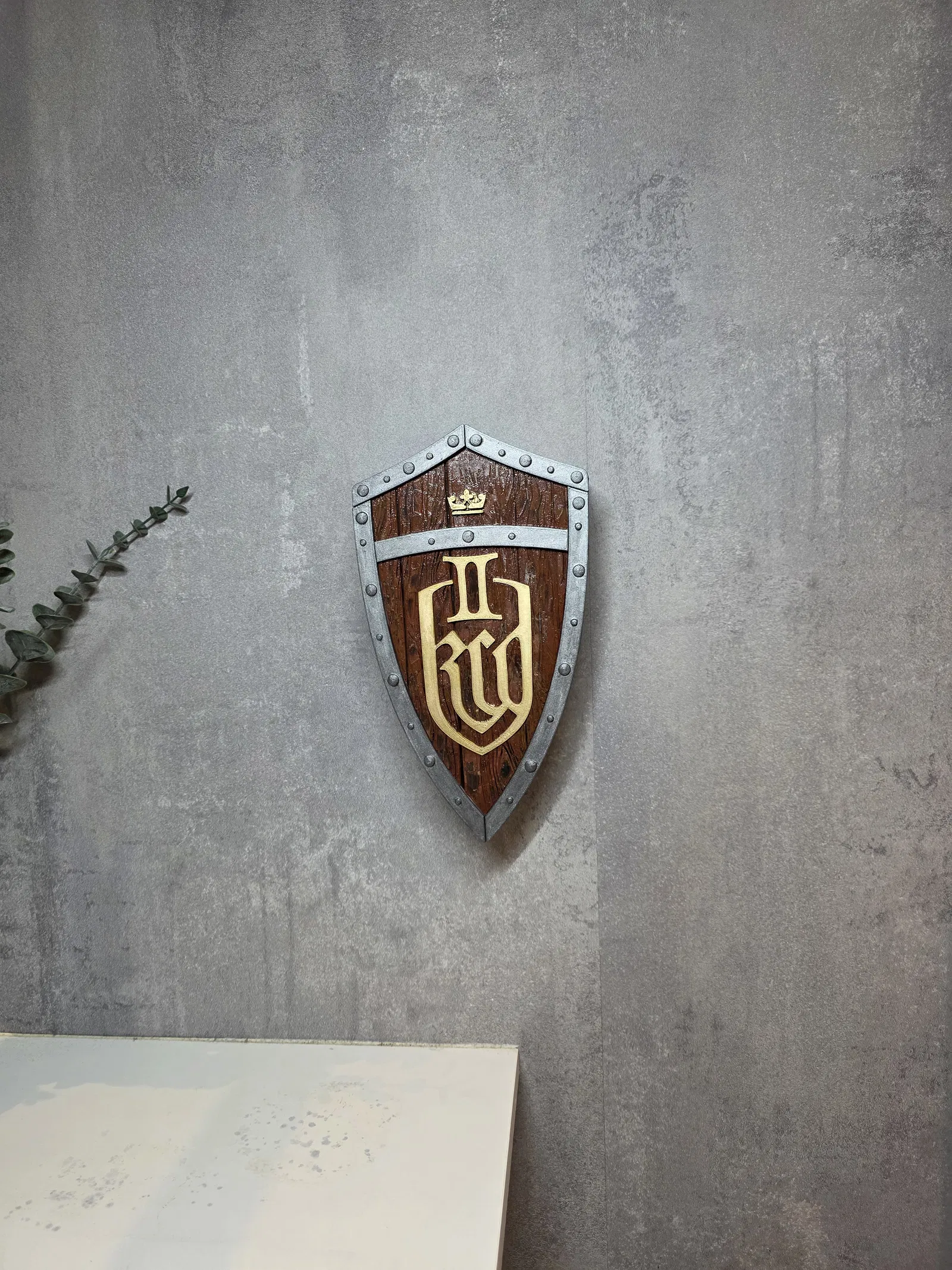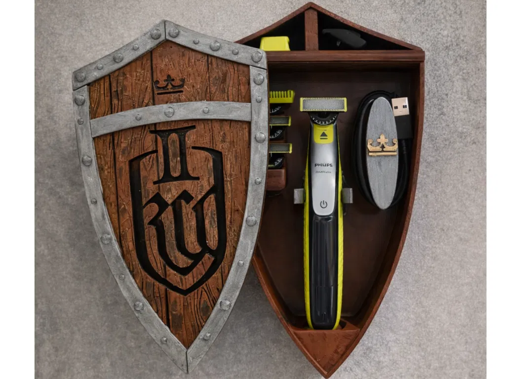 Tủ treo tường Shieldwright cho Philips OneBlade, lấy cảm hứng Kingdom Come. Cửa khiên trượt, kẹp thụ động giữ máy chắc chắn, có khe lưỡi dự phòng, kệ phụ kiện và ngàm gọn dây sạc. In print-in-place, không cần supports.