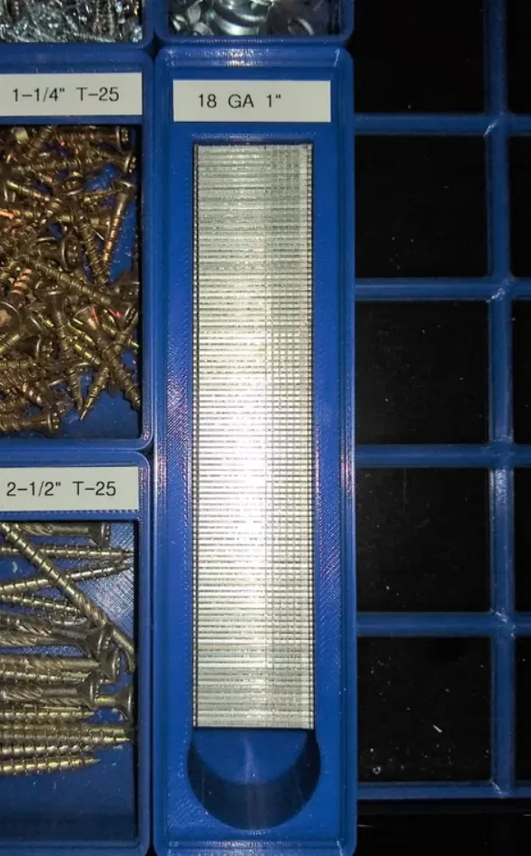 Bộ khay/holder chuẩn Gridfinity để đựng nhiều size đinh brad 18 gauge (từ 5/8" tới 2"). Khuyến nghị nạp đinh theo từng 1–2 dải để dễ xếp và đỡ kẹt.