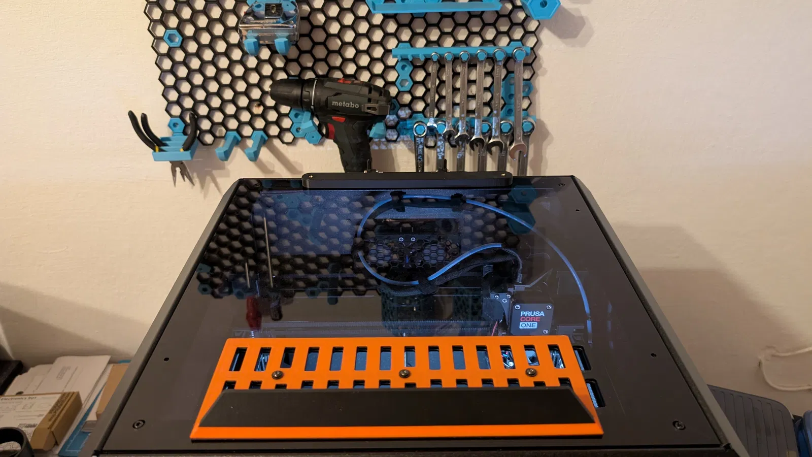 Mẫu Prusa Core One Top Cover Hinge đơn giản, dễ làm: chỉ cần 2 chi tiết in kèm vài vít/đai ốc M3 và chút chỉnh sửa top cover. Khuyến nghị khoét lỗ chìm trên tấm polycarbonate để nắp nằm phẳng, đều hơn.