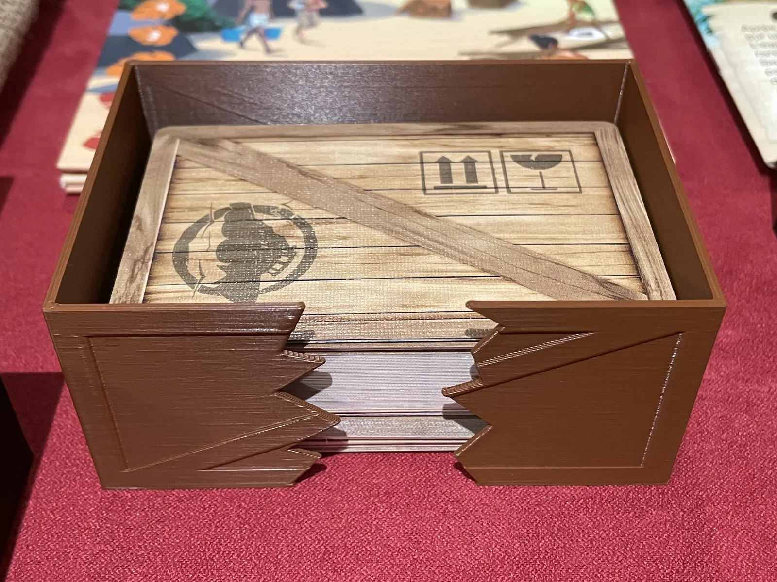 Phần khay giữ bộ bài “wreck” bằng bìa carton đi kèm game mình bỏ luôn, vì không có cách nào làm nó vừa mà không phải ép phẳng lại. Vì vậy mình dành thêm thời gian để thiết kế khay bài cỡ vừa cho nhìn giống một cái thùng hàng bị vỡ (nếu in được màu nâu thì càng đẹp!).