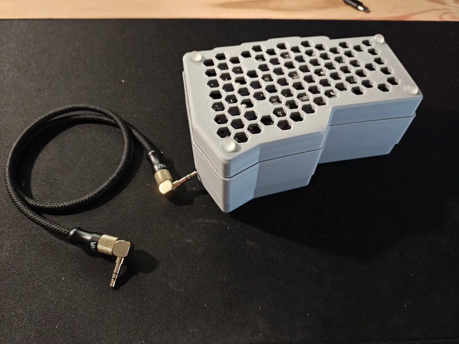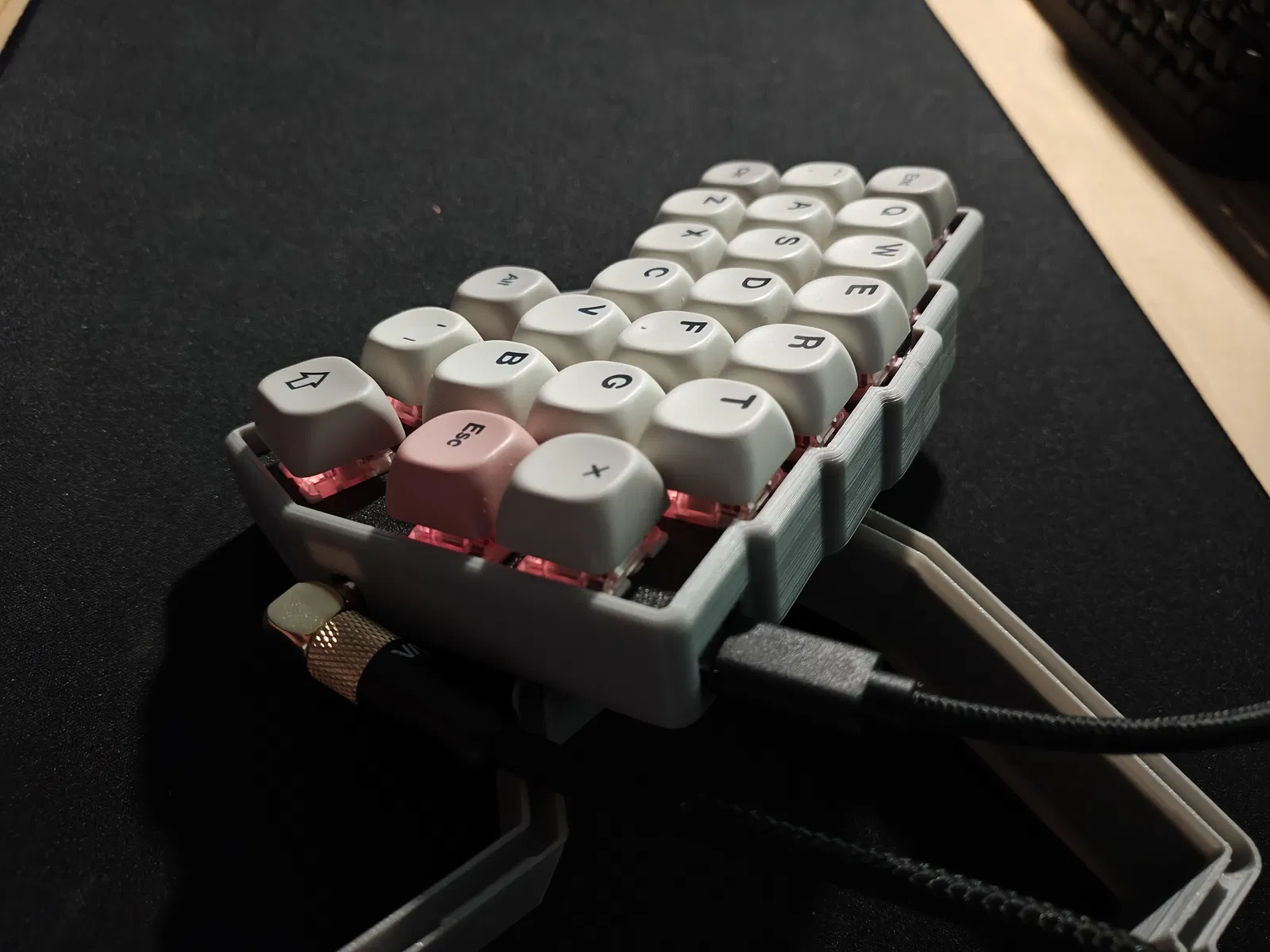 Mẫu này được thiết kế cho bàn phím corne 46 phím, nhưng chắc cũng dùng được với hầu hết các board corne v4. Vỏ case có hai phần inset nằm ở hai phía đối diện của tường bên trong. Các inset này khớp với các gờ trên brace để bấm “snap-on” rất nhanh. Khi cần tháo, bóp brace hướng vào trong tại vị trí các inset để dễ nhả khỏi case.
