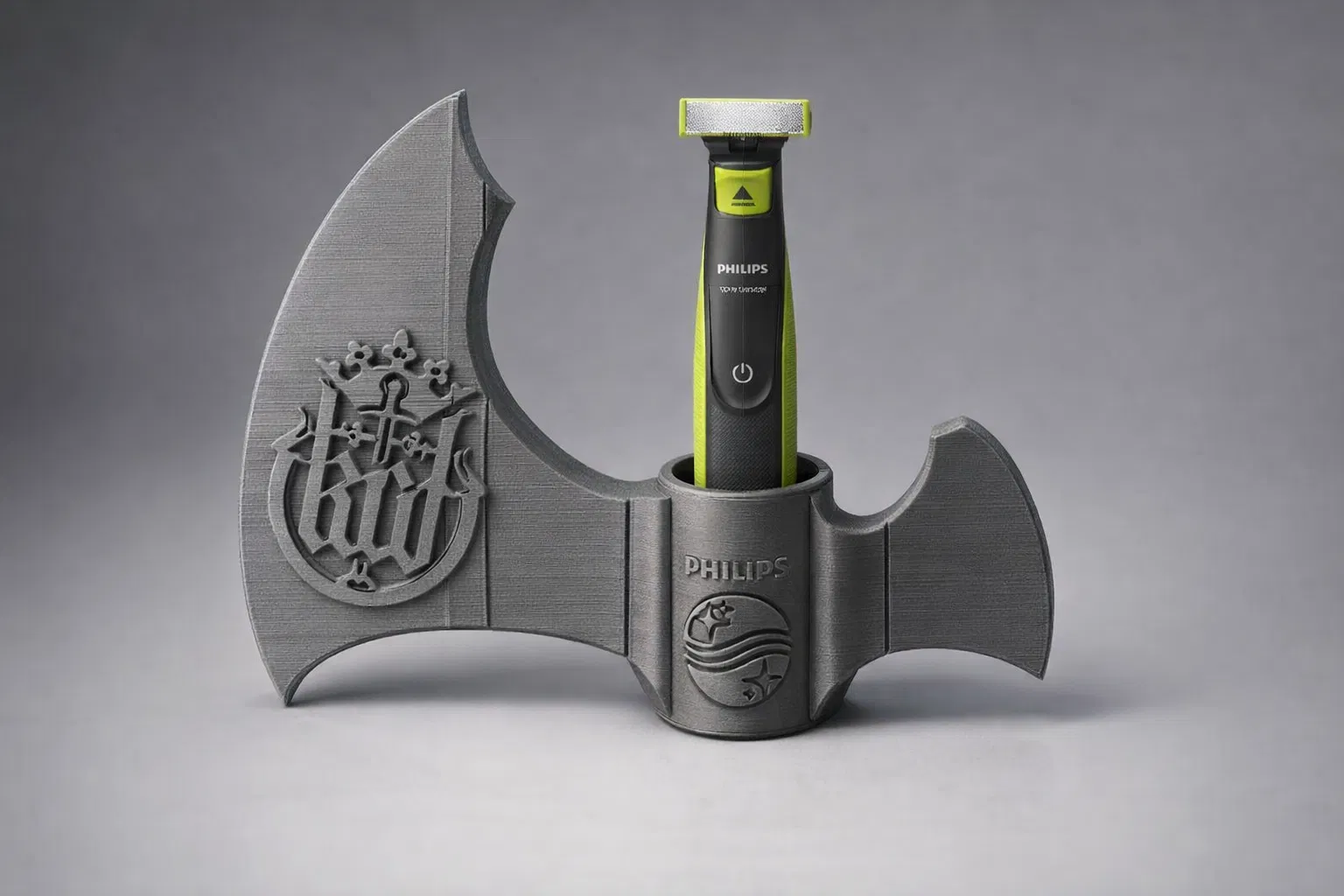 Mẫu giá đỡ/khay để đồ lấy cảm hứng từ rìu trong Kingdome Come, thiết kế để dùng với Philips OneBlade. Phù hợp làm phụ kiện trưng bày hoặc sắp xếp đồ gọn gàng.