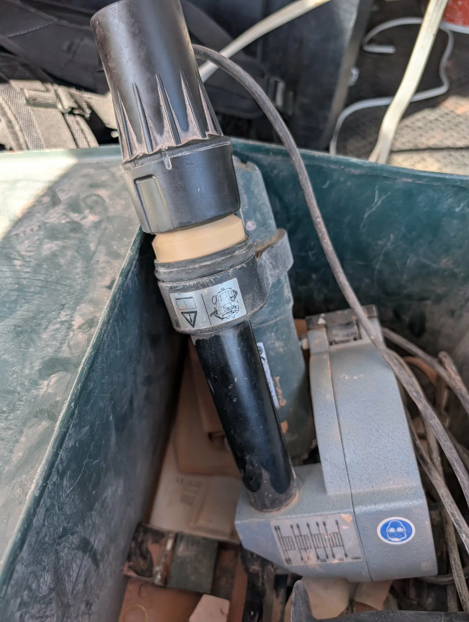 Một cái adapter giúp kết nối trực tiếp từ máy Matabo chaser sang DeWalt Dust Extractor.