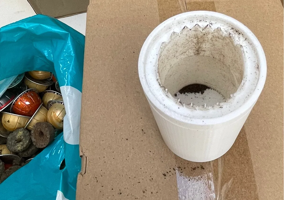 Dụng cụ cắt/mở pod Nespresso Vertuo in 3D hoàn toàn, kèm thùng hứng gắn rời. Thiết kế không cần lưỡi dao lam để an toàn hơn; phần “lưỡi” dự kiến bền khoảng 200–300 lần mở pod.
